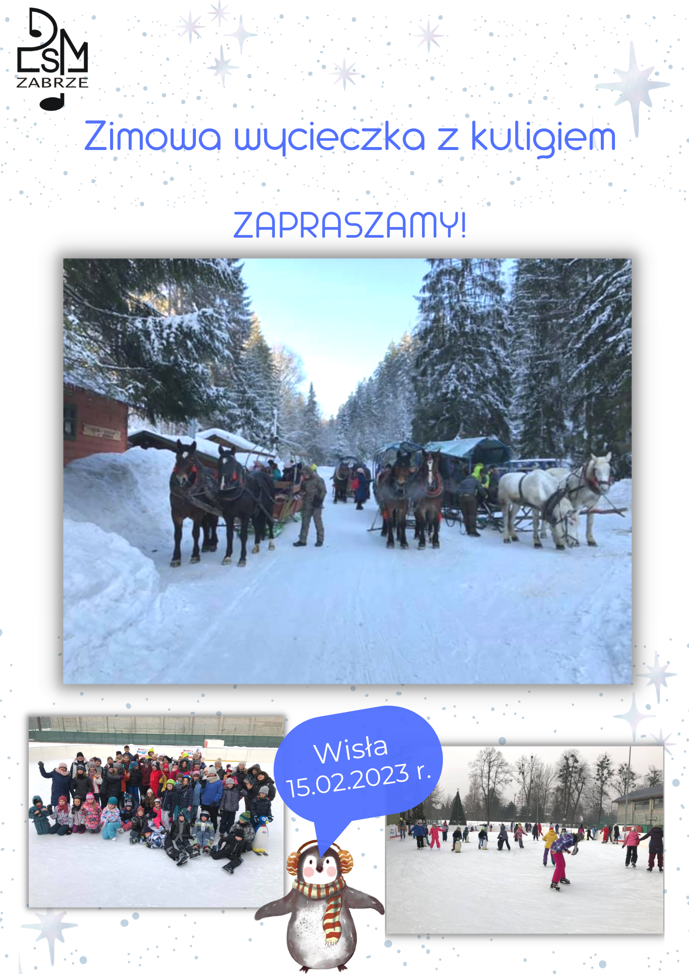 Zapraszamy uczniów od klasy IV/c.6 i III/c.4 szkoły muzycznej I stopnia oraz uczniów szkoły muzycznej II stopnia na wycieczkę do Wisły. W programie: lodowisko w Wiśle, kulig z pieczeniem kiełbasek w Wiśle Czarne oraz popołudniowy spacer po centrum Wisły. Szczegółowych informacji udzielają i zapisy przyjmują p. M. Różak i p. A. Roterman. Zapisy do 13 lutego 2023.