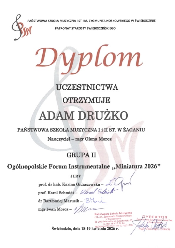 W dniach: 18 - 19 kwietnia 2026 w Państwowej Szkole Muzycznej I stopnia im. Zygmunta Noskowskiego w Świebodzinie odbyło się Ogólnopolskie Forum Instrumentalne „Miniatura 2026”. Podczas Forum odbył się także Konkurs (online i stacjonarnie - do wyboru uczestnika) przeznaczony wszystkich klas instrumentalnych Państwowych