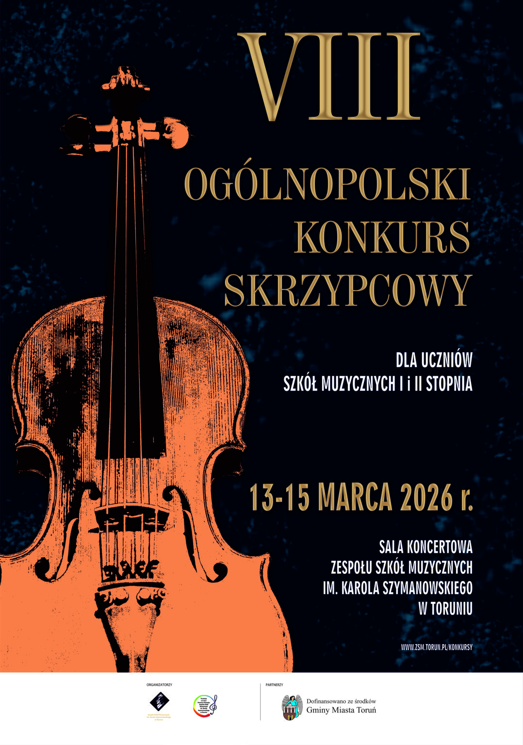 W dniach: 13 – 15 marca 2026 r. w Sali Koncertowej im. prof. Reginy Smendzianki Zespołu Szkół Muzycznych im. Karola Szymanowskiego w Toruniu odbywał się VIII Ogólnopolski Konkurs Skrzypcowy dla uczniów szkół muzycznych I i II stopnia. Organizatorem Konkursu był Zespół Szkół Muzycznych im. Karola Szymanowskiego w Toruniu i Fundacja na Rzecz Pomocy i Rozwoju Zespołu Szkół Muzycznych im. Karola Szymanowski w Toruniu. Przesłuchania konkursowe przeprowadzono w czterech kategoriach wiekowych:
