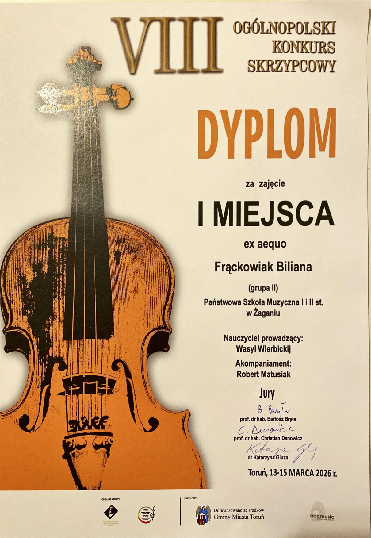 Na Konkursie znakomicie zaprezentowała się nasza uczennica klasy skrzypiec: Biliana Frąckowiak – klasa V/6 PSM I stopnia, naucz: mgr Wasyl Wierbiskij. Biliana zdobyła I miejsce w grupie II. Podczas występu konkursowego Bilianie na fortepianie towarzyszył mgr Robert Matusiak z Zespołu Szkół Muzycznych w Toruniu. Gratulujemy!