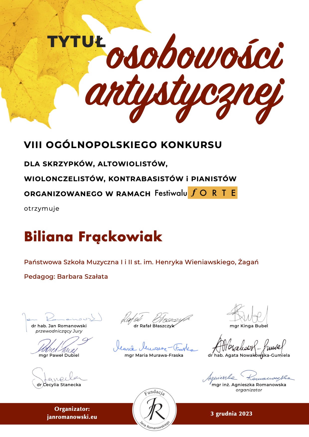 Fundacja Jana Romanowskiego zorganizowała dla uczniów klas skrzypiec, altówki, wiolonczeli, kontrabasu i fortepianu VIII Ogólnopolski Konkurs w ramach Festiwalu Forte 2023. Konkurs odbywał się w formule on-line, uczestnicy byli oceniani w siedmiu grupach wiekowo-klasowych. Na Konkursie znakomicie zaprezentowała się nasza uczennica Biliana Frąckowiak – uczennica klasy III/6 PSM I stopnia w klasie skrzypiec mgr Barbary Szałaty. Biliana zdobyła tytuł Laureata oraz pozaregulaminowy tytuł Osobowości Artystycznej Konkursu. Podczas konkursowego nagrania na fortepianie towarzyszył jej mgr Wojciech Zawiślak. Gratulujemy!