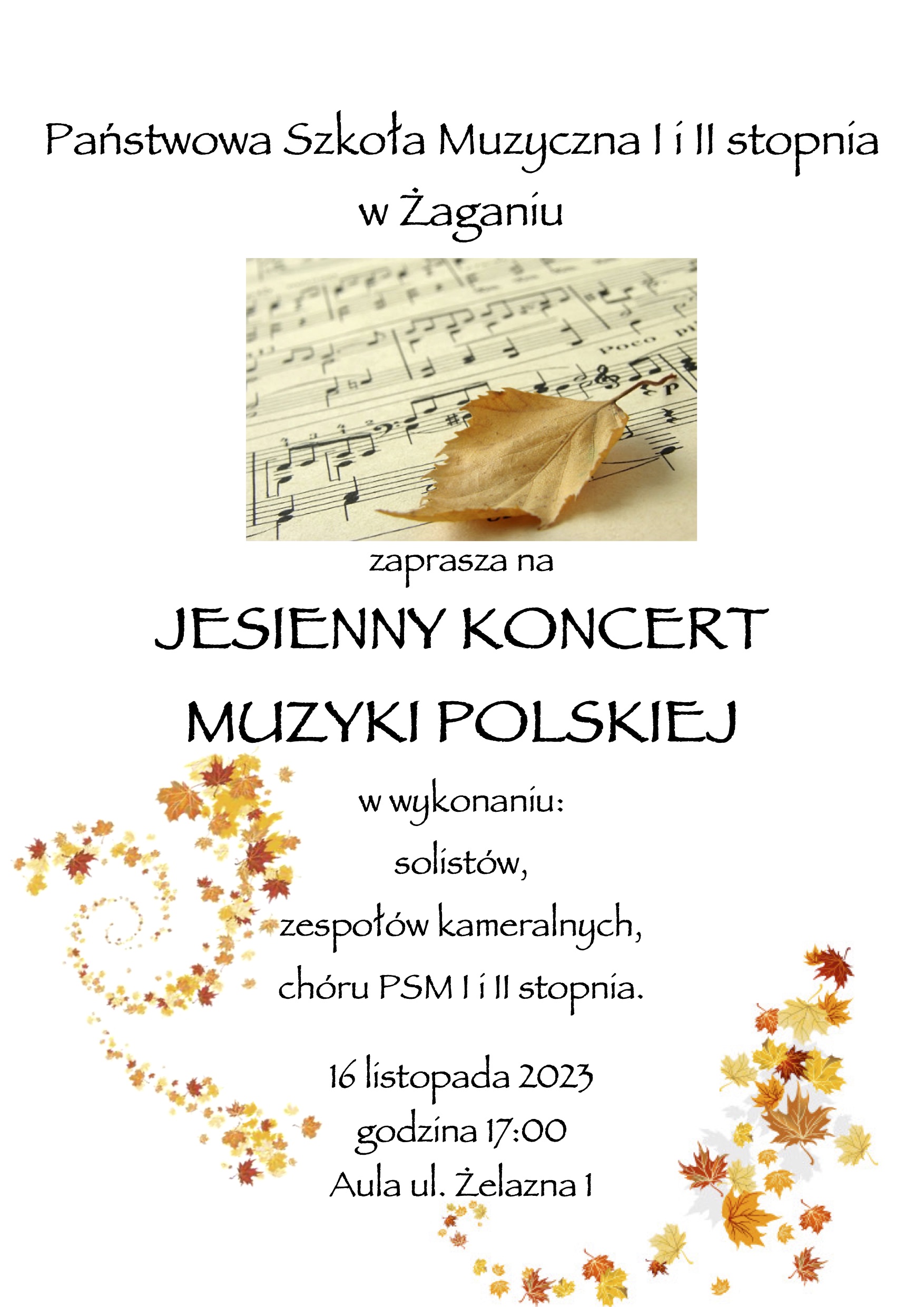 Państwowa Szkoła Muzyczna I i II stopnia w Żaganiu serdecznie zaprasza na Jesienny Koncert Muzyki Polskiej w wykonaniu solistów, zespołów kameralnych oraz chóru. Odbędzie się on w naszej Auli w budynku przy ul. Żelaznej 1. Zapraszamy w czwartek, 16 listopada o godz. 17:00. Wstęp wolny.
