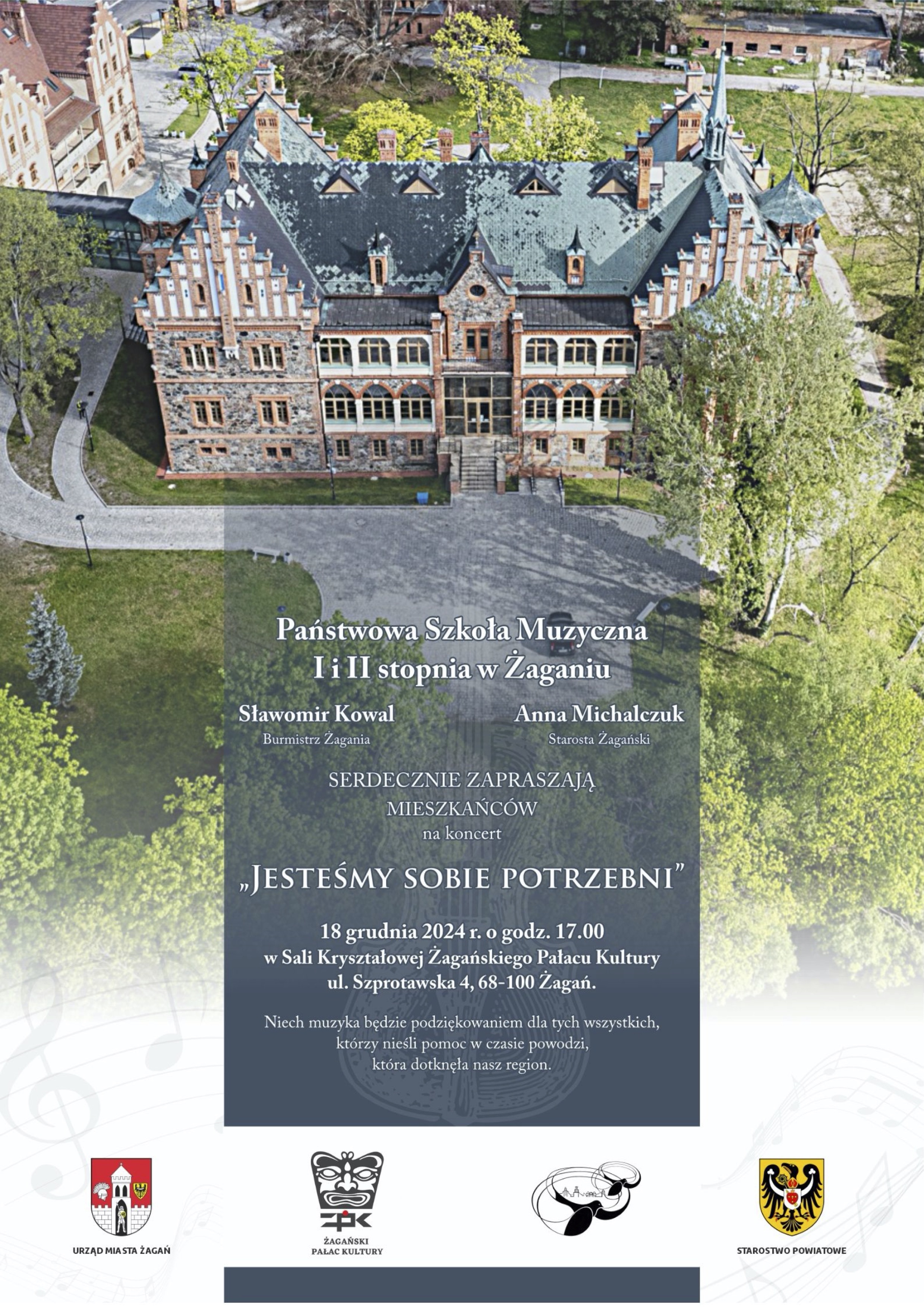 18 grudnia 2024 r. odbędzie się wyjątkowy koncert w wykonaniu naszych solistów, orkiestry i chóru szkolnego. Koncertem tym - "Jesteśmy sobie potrzebni" - chcemy podziękować wszystkim, którzy pomogli nam zabezpieczyć żagański Hoghwart podczas powodzi. Wspólnie ze Starostą Powiatu Żagańskiego Panią Anną Michalczuk, Burmistrzem Miasta Żagań Panem Sławomirem Kowalem, zapraszamy do Sali Kryształowej Żagańskiego Pałacu Kultury o godz. 17:00. Wstęp wolny.