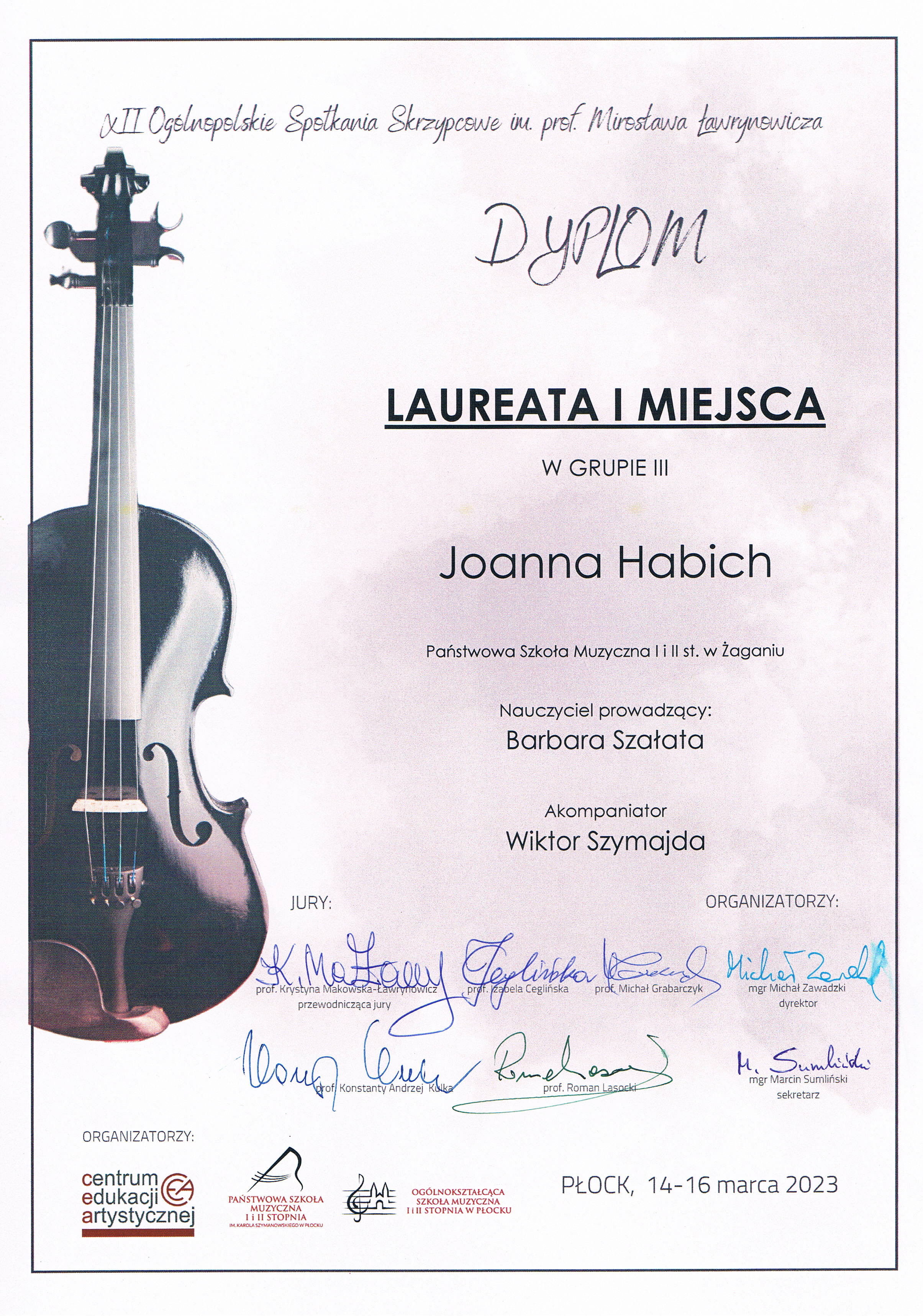 W dniach: 13 -17 marca 2023 r. odbywały się XII Ogólnopolskie Spotkania Skrzypcowe im. prof. Mirosława Ławrynowicza, których organizatorami byli: Centrum Edukacji Artystycznej oraz Państwowa Szkoła Muzyczna l i II st. im. Karola Szymanowskiego i Ogólnokształcąca Szkoła Ogólnokształcąca Szkoła Muzyczna I i II st. w Płocku. Przesłuchania konkursowe prowadzone były w trzech grupach: grupa l - uczniowie klas I – II szkół muzycznych l st. cyklu 4-letniego, uczniowie klas I – III szkół muzycznych l st. cyklu 6-letniego oraz uczniowie klas I – III ogólnokształcących szkół muzycznych l st.; grupa II - uczniowie klas III – IV szkół muzycznych l st. cyklu 4-letniego, uczniowie klas IV – VI szkół muzycznych l st. cyklu 6-letniego oraz uczniowie klas IV – VI ogólnokształcących szkół muzycznych l st.; grupa III - uczniowie klas I – III szkół muzycznych II st. oraz uczniowie klas VII – VIII ogólnokształcących szkół muzycznych I st. Jury Konkursu, powołane przez dyrektora Centrum Edukacji Artystycznej, złożone z wybitnych pedagogów polskich uczelni muzycznych, a pracujące pod przewodnictwem prof. Krystyny Makowskiej-Ławrynowicz, wyłoniło laureatów oraz przyznało szereg wyróżnień, podkreślając bardzo wysoki poziom konkursu. Naszą szkołę reprezentowała na Spotkaniach Joanna Habich - uczennica mgr Barbary Szałaty w klasie II PSM II stopnia. Miło nam poinformować, iż Jury przyznało Joasi I nagrodę w grupie III. Po konkursowej prezentacji nasza skrzypaczka została zaproszona przez jurorów na indywidualną analizę prezentacji, podczas której zebrała wiele pochwał dotyczących swej gry. W czasie konkursu towarzyszył Asi na fortepianie Wiktor Szymajda.Serdecznie gratulujemy!