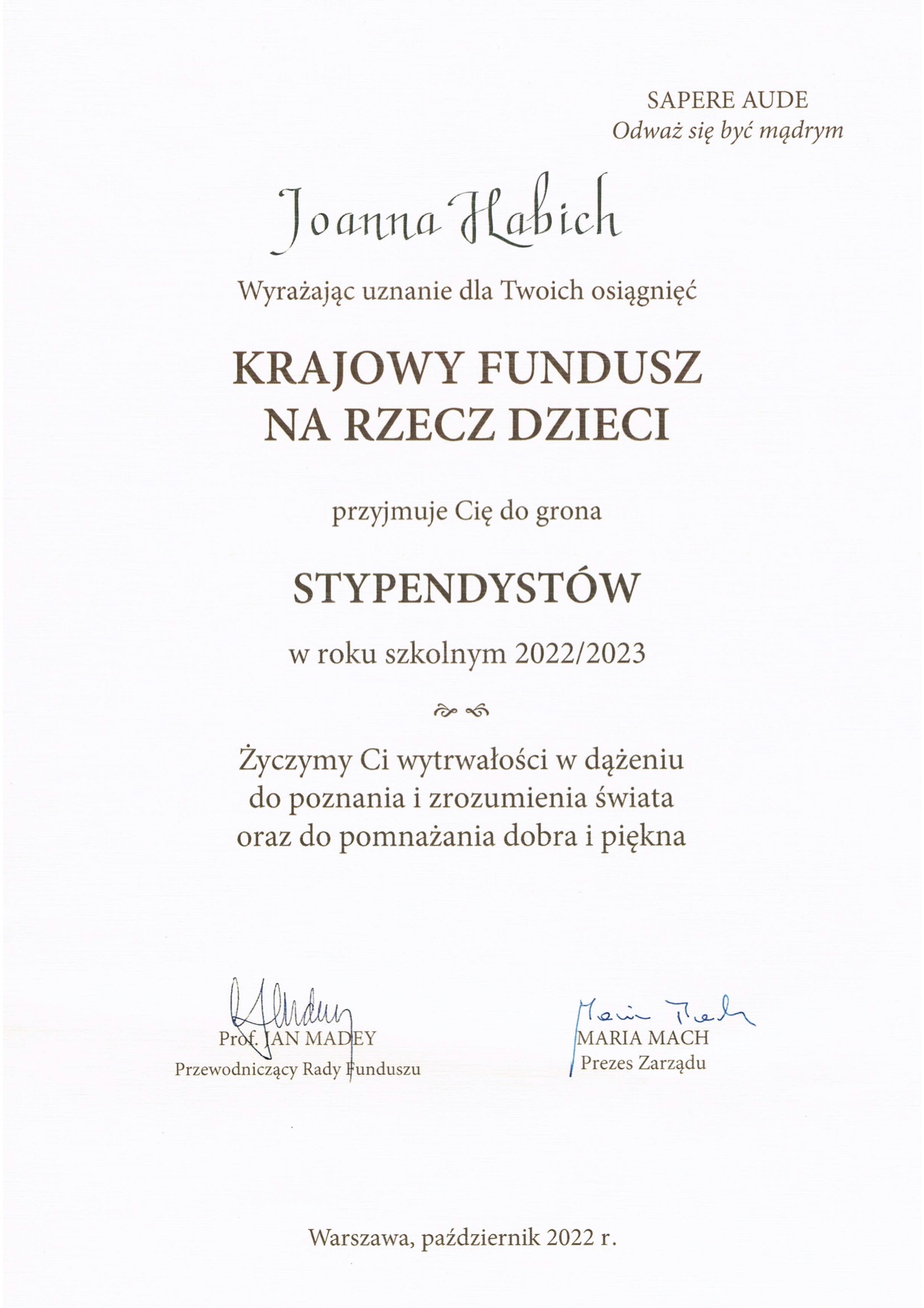 Joanna Habich stypendystką programu Zdolni Krajowego Funduszu Na Rzecz Dzieci