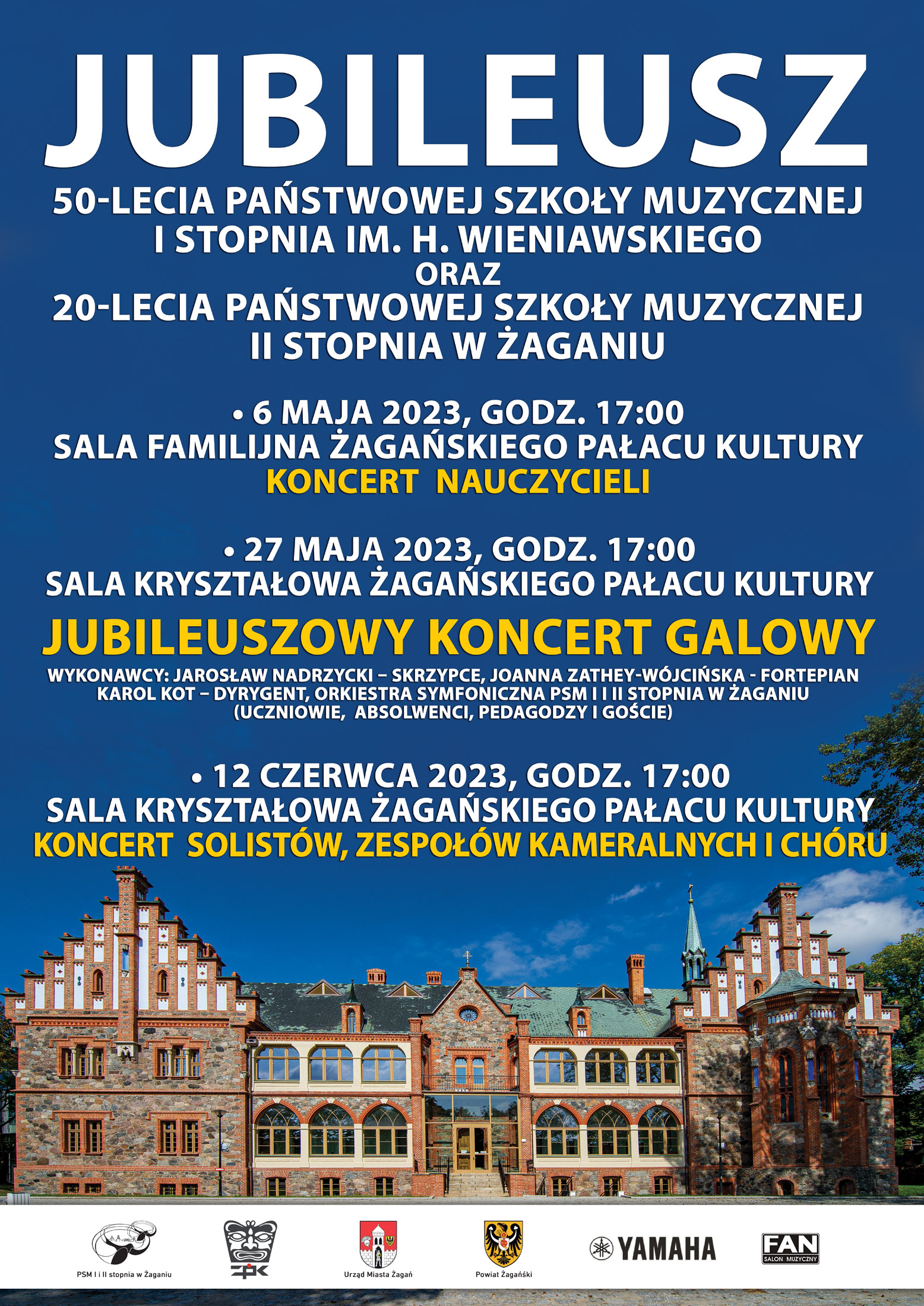 Coraz bliżej do uroczystych obchodów jubileuszu naszej szkoły. Państwowa Szkoła Muzyczna I stopnia im. Henryka Wieniawskiego – świętować będzie swoje 50-lecie; Państwowa Szkoła Muzyczna II stopnia – 20-lecie. Z tej okazji przygotowujemy cykl koncertów, na które zapraszamy nauczycieli, emerytów, pracowników i byłych pracowników Szkoły, wszystkich uczniów – obecnych i byłych, absolwentów, rodziców, przyjaciół i wszystkich żagańskich melomanów. W sobotę, 6 maja 2023 o godz. 17.00 w Sali Familijnej Żagańskiego Pałacu Kultury odbędzie się Koncert nauczycieli. W sobotę, 27 maja 2023, o godz. 17.00, w Sali Kryształowej Żagańskiego Pałacu Kultury odbędzie się Jubileuszowy Koncert Galowy, z udziałem najsławniejszego absolwenta Szkoły – skrzypka Jarosława Nadrzyckiego, pianistki Joanny Zathey-Wójcińskiej oraz Orkiestry Symfonicznej PSM I i II stopnia w Żaganiu pod dyrekcją Karola Kota. W poniedziałek, 12 czerwca 2023, o godz. 17.00, w Sali Kryształowej Żagańskiego Pałacu Kultury – Koncert solistów, zespołów kameralnych i chóru. Z pewnością dla każdego znajdzie się coś miłego, bo repertuar tych koncertów jest bardzo urozmaicony. Serdecznie zapraszamy!
