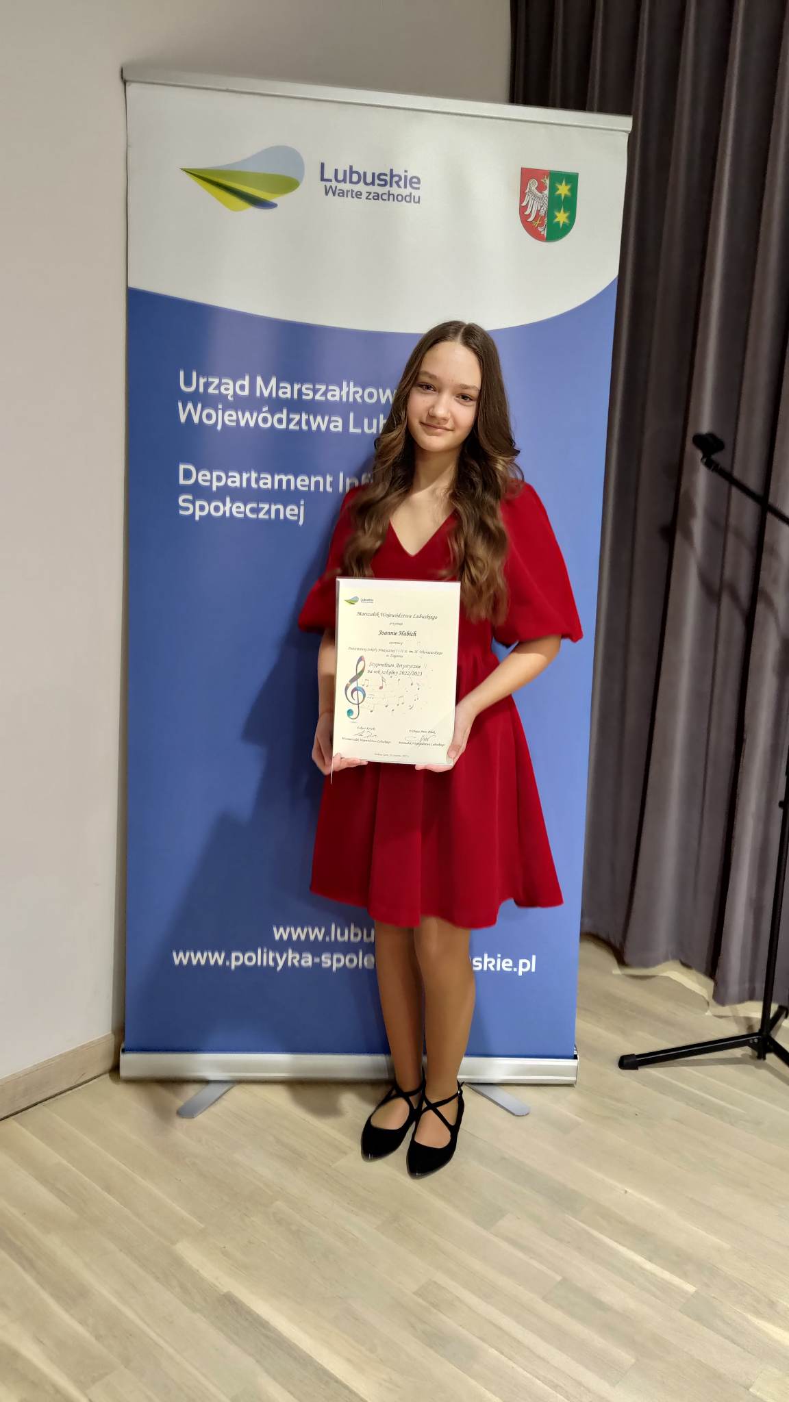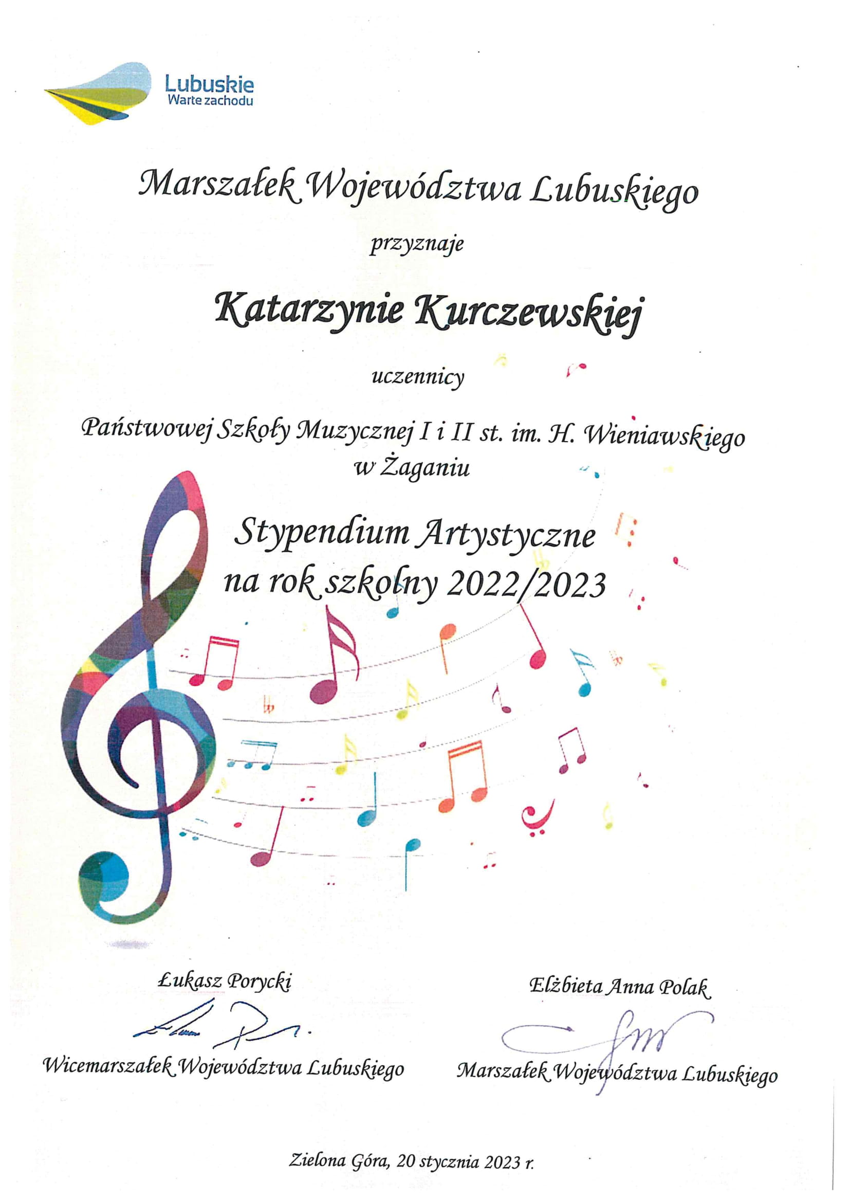 W miniony piątek, 20 stycznia 2023 r. w Muzeum Ziemi Lubuskiej odbyła się uroczystość wręczenia stypendiów naukowych, twórczych i artystycznych wybitnie uzdolnionym uczniom naszego regionu. Stypendia te ustanowione zostały w celu stworzenia wybitnie uzdolnionym uczniom odpowiednich warunków do dalszego kształcenia się i rozwoju, a także inspirowania młodzieży do podejmowania kolejnych zadań. Są też formą promocji młodych ludzi, którzy realizując swoje pasje, zainteresowania i aspiracje, przyczyniają się do pomnażania dorobku intelektualnego naszego regionu. O wyróżnienie ubiegało się w tym roku 110 uczniów, w tym: 63 wnioski o stypendium naukowe, 42 wnioski o stypendium artystyczne i 5 wniosków o stypendium twórcze. Zarząd Województwa Lubuskiego 13 grudnia 2022 r. zatwierdził rekomendację Komisji Stypendialnej i przyznał stypendia 25 uczniom w podziale na stypendia naukowe, twórcze i artystyczne. Z satysfakcją informujemy, że w gronie stypendystów kolejny raz znalazły się nasze uczennice PSM II stopnia: Katarzyna Kurczewska, klasa I skrzypce w klasie mgr Wasyla Wierbickiego oraz Joanna Habich, klasa II skrzypce w klasie mgr Barbary Szałaty.