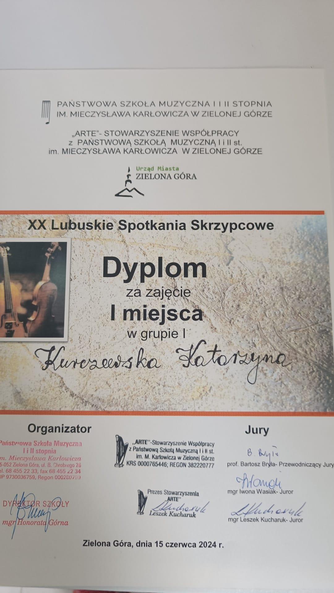 15 czerwca 2024 r. w Auli Państwowej Szkoły Muzycznej I i II stopnia im. Mieczysława Karłowicza odbyły się XX Lubuskie Spotkania Skrzypcowe. W Spotkaniach wzięli udział skrzypkowie z całej Polski w dwóch grupach wiekowych: młodszej i starszej. Miło nam poinformować, że nasza uczennica klasy II PSM II stopnia - Katarzyna Kurczewska (klasa mgr Wasyla Wierbickiego) zdobyła w grupie młodszej I nagrodę! Podczas występu konkursowego Kasi na fortepianie towarzyszył mgr Wojciech Zawiślak. Serdecznie gratulujemy!!!