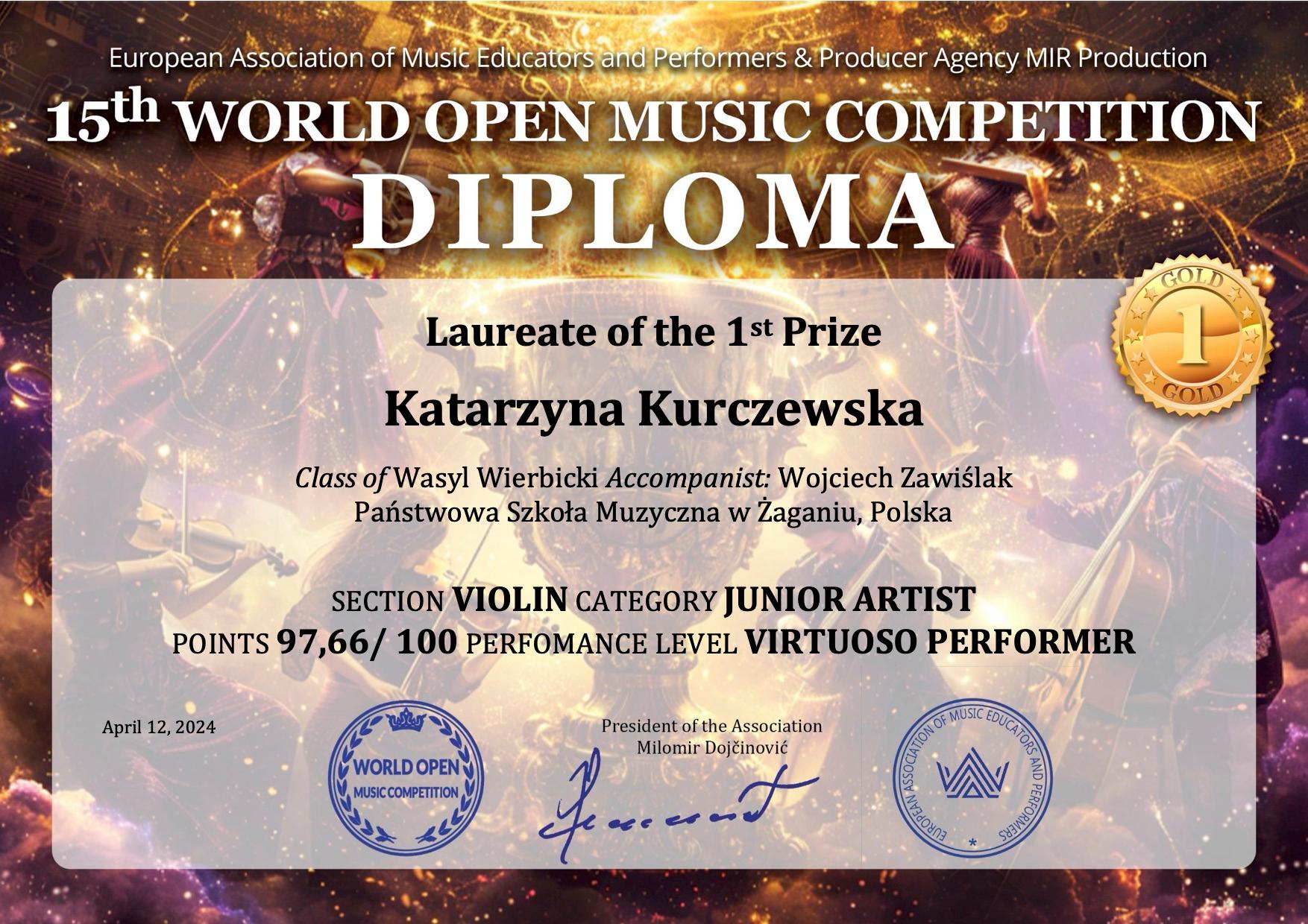 Dotarła do nas wspaniała informacja o kolejnym sukcesie, jaki odniosła nasza uczennica klasy skrzypiec PSM II stopnia - Katarzyna Kurczewska. Wzięła ona udział w Międzynarodowym Konkursie Internetowym – 15 th WORLD OPEN MUSIC COMPETITION. Konkurs polega na nagraniu kompozycji wykonanych na pamięć i przesłanie ich drogą internetową. W Konkursie nasza uczennica zdobyła I miejsce! Kasia uczy się w klasie skrzypiec mgr Wasyla Wierbickiego, podczas konkursowego nagrania, przy fortepianie towarzyszył jej mgr Wojciech Zawiślak. Serdecznie gratulujemy!
