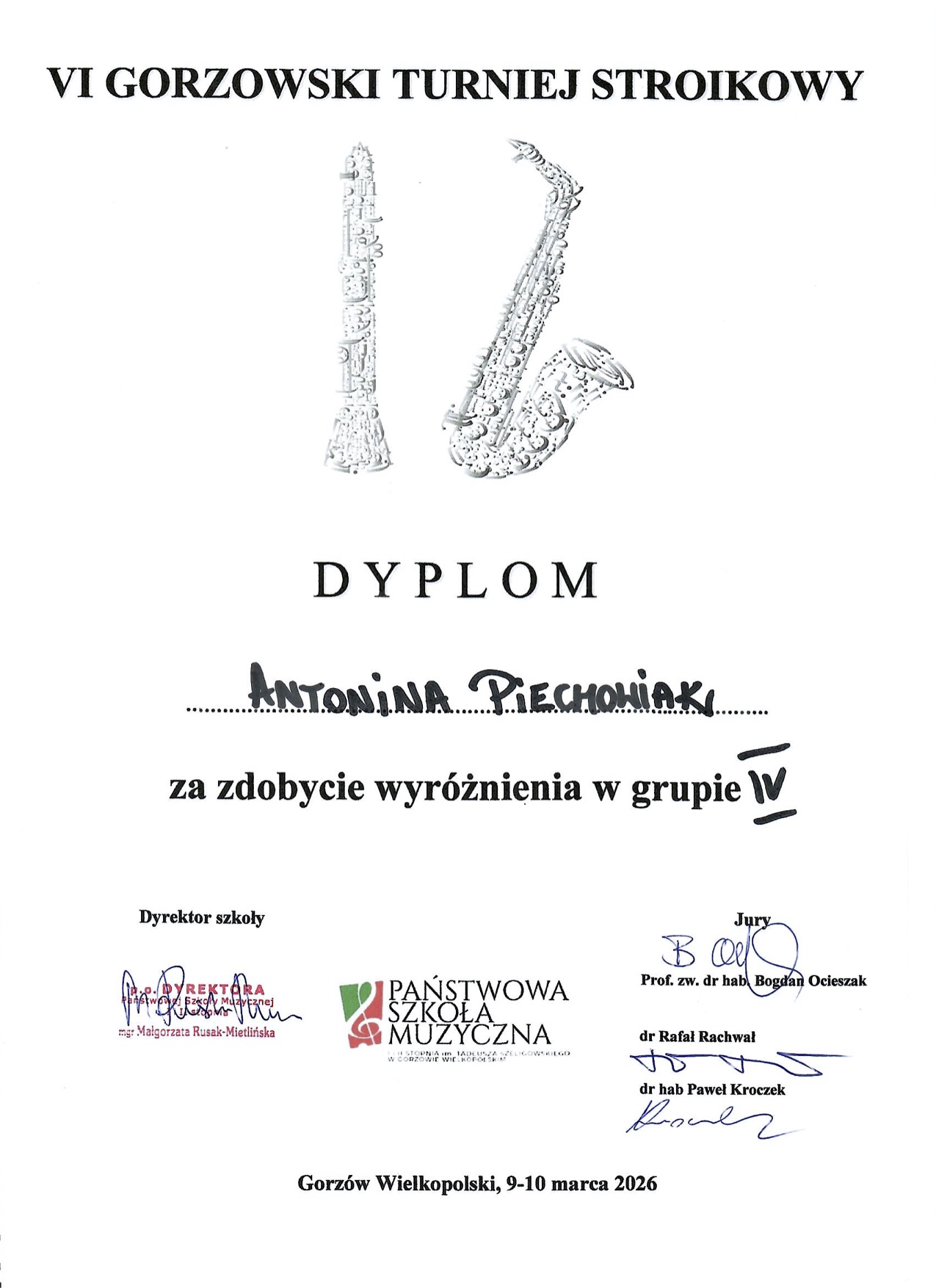 Na Konkursie bardzo dobrze zaprezentowała się nasza uczennica (klasa VI PSM II st., nauczyciel – mgr Krzysztof Krzyśków) Antonina Piechowiak - klarnet, która zdobyła Wyróżnienie w grupie IV. W czasie konkursowej prezentacji Antoninie towarzyszył na fortepianie mgr Wojciech Zawiślak. Serdecznie gratulujemy!