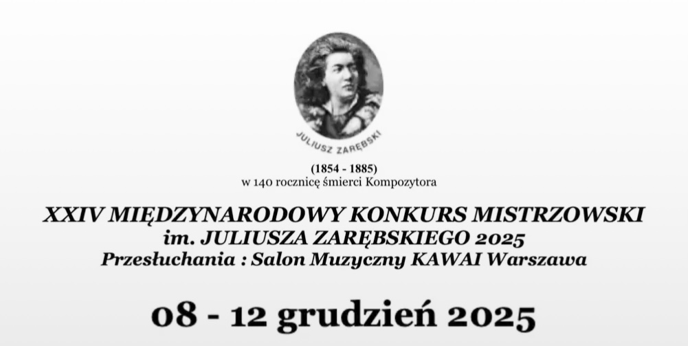W dniach: 8-12 grudnia 2025 w Warszawie odbywał się XXIV Międzynarodowy Konkurs Mistrzowski im. Juliusza Zarębskiego 2025. Organizatorem Konkursu była Fundacja Kultury i Edukacji im. Juliusza Zarębskiego, przesłuchania konkursowe odbywały się w Salonie Muzycznym Kawai, natomiast Koncert laureatów w Sali Wielkiej Zamku Królewskiego w Warszawie.