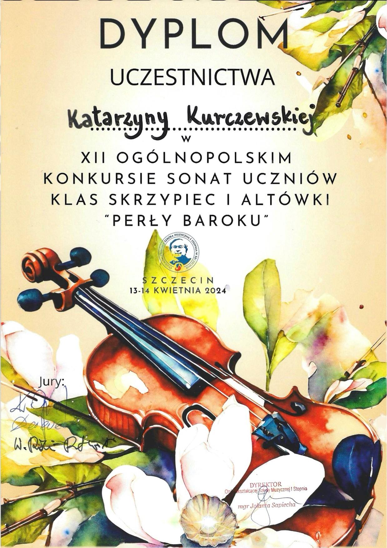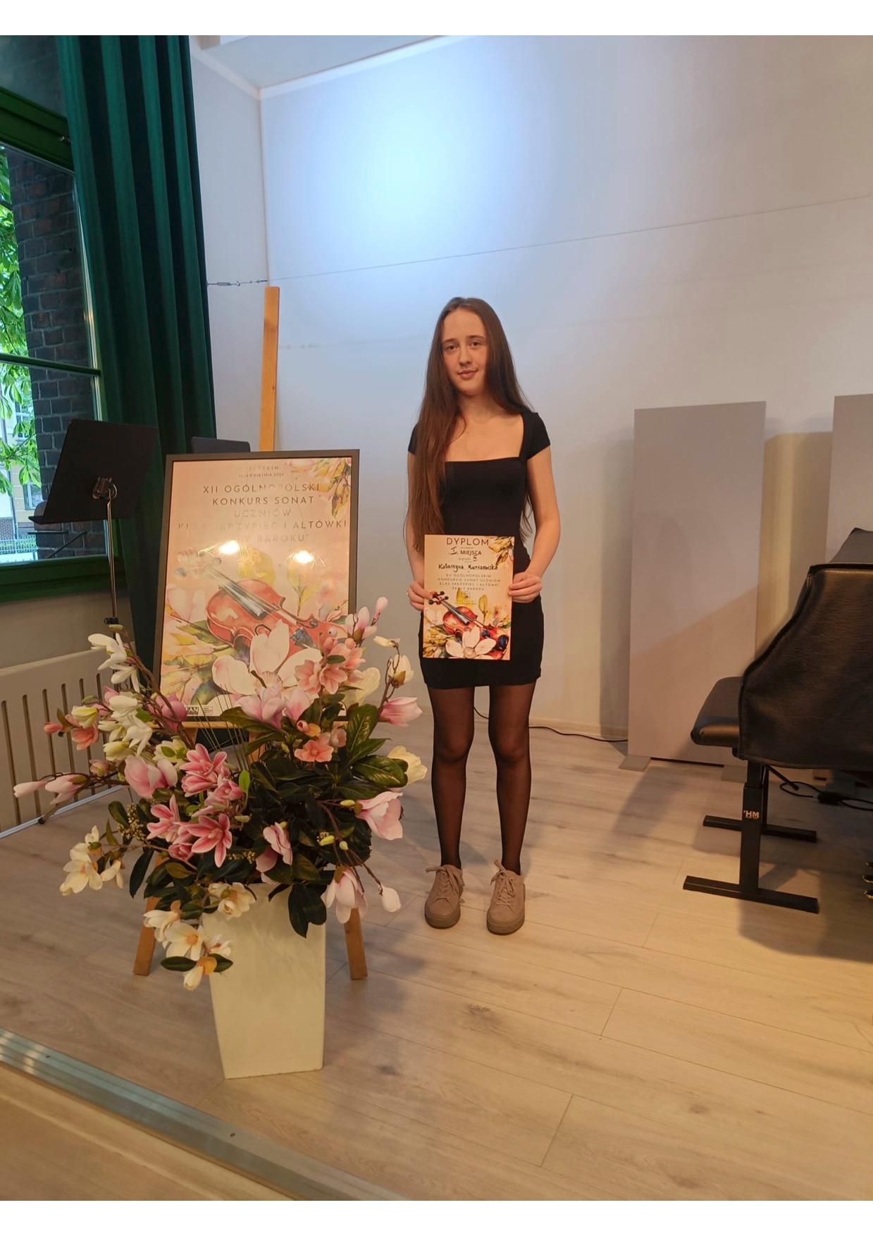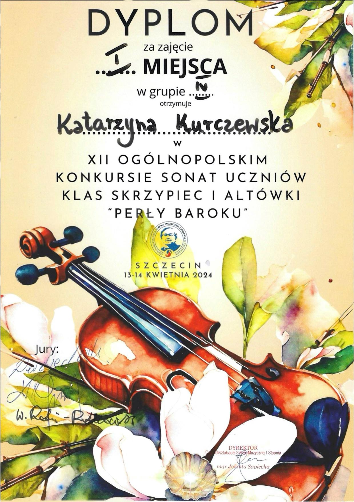 13 - 14 kwietnia 2024 r. w Ogólnokształcącej Szkole Muzycznej im. prof. Marka Jasińskiego w Szczecinie odbył się XII Ogólnopolski Konkurs Sonat dla uczniów klas skrzypiec i altówki "Perły Baroku". Przesłuchania konkursowe odbywały się w czterech grupach wiekowych. Na Konkursie wspaniale zaprezentowała się nasza uczennica PSM II stopnia: Katarzyna Kurczewska, klasa II - pracująca pod okiem mgr Wasyla Wierbickiego. Kasia zdobyła I Miejsce w Grupie IV. Podczas występu konkursowego na fortepianie towarzyszył jej mgr Wojciech Zawiślak. Serdecznie gratulujemy!