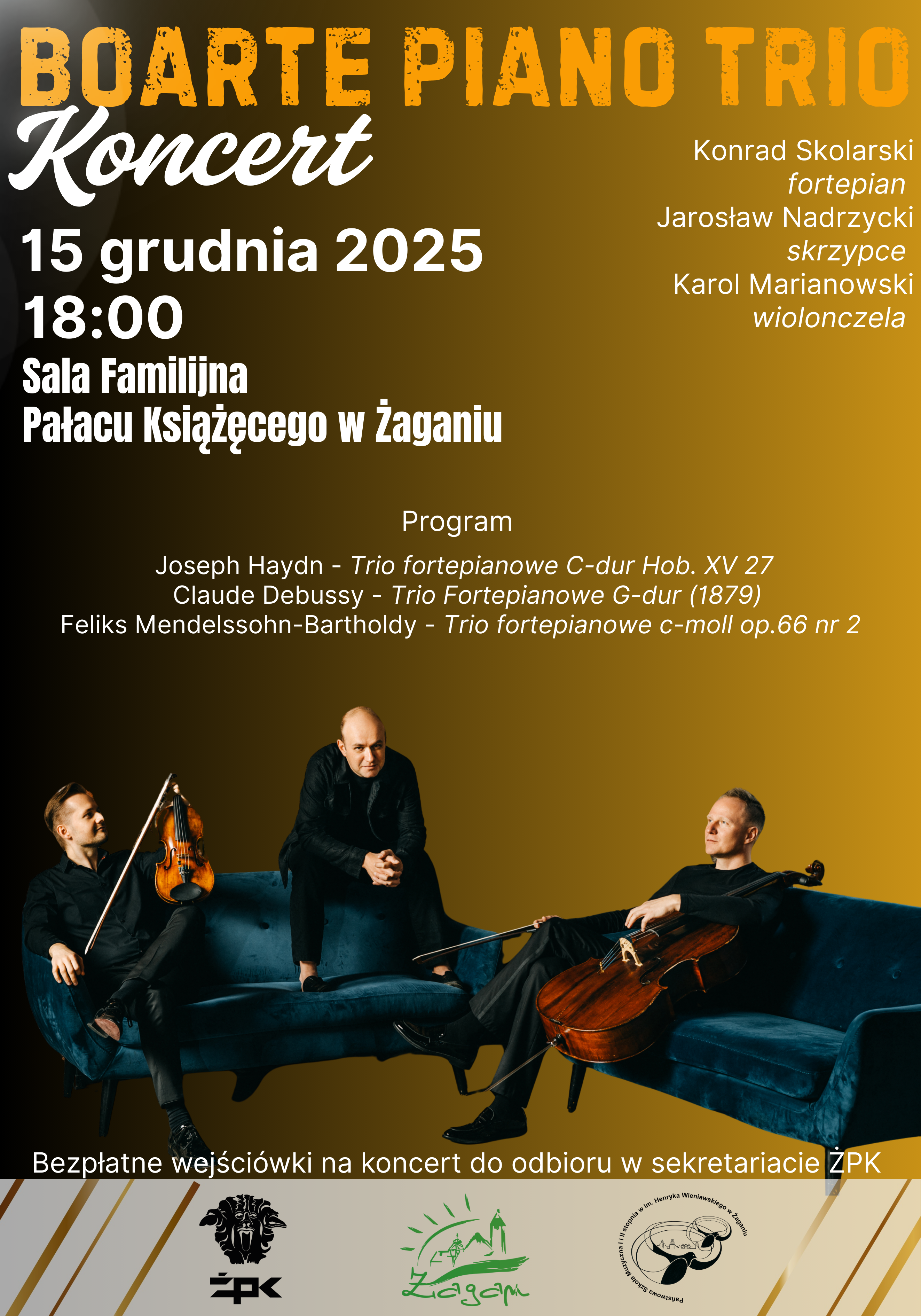 Z przyjemnością informujemy, że w poniedziałek, 15 grudnia br. o godz. 18.00, w Sali Familijnej Żagańskiego Pałacu Książęcego odbędzie się nadzwyczajny KONCERT KAMERALNY. Wystąpi znakomity zespół – Boarte Piano Trio, którego członkiem jest żaganianin roku 2001, absolwent żagańskiej szkoły muzycznej, obecnie znany w świecie skrzypek – JAROSŁAW NADRZYCKI. Wraz z nim zespół tworzą równie wybitni instrumentaliści – KONRAD SKOLARSKI – pianista oraz KAROL MARIANOWSKI – wiolonczelista. Zarówno jako soliści, jak i kameraliści (wcześniej także członkowie utytułowanego Meccore String Quartet) artyści ci zdobyli międzynarodową renomę występując we wszystkich krajach Europy, w obu Amerykach i w Azji. Są zwycięzcami wielu prestiżowych międzynarodowych konkursów. Posiadają wiele nagrań (za które otrzymali szereg nagród fonograficznych). Występowali jako soliści z czołowymi orkiestrami świata pod batutą wybitnych dyrygentów; współpracowali ze znanymi osobistościami świata muzyki kameralnej. Ze swego bogatego repertuaru na grudniowy koncert wybrali trzy tria: Josepha Haydna, Claude’a Debussy’ego oraz Feliksa Mendelssohna-Bartholdy’ego.
