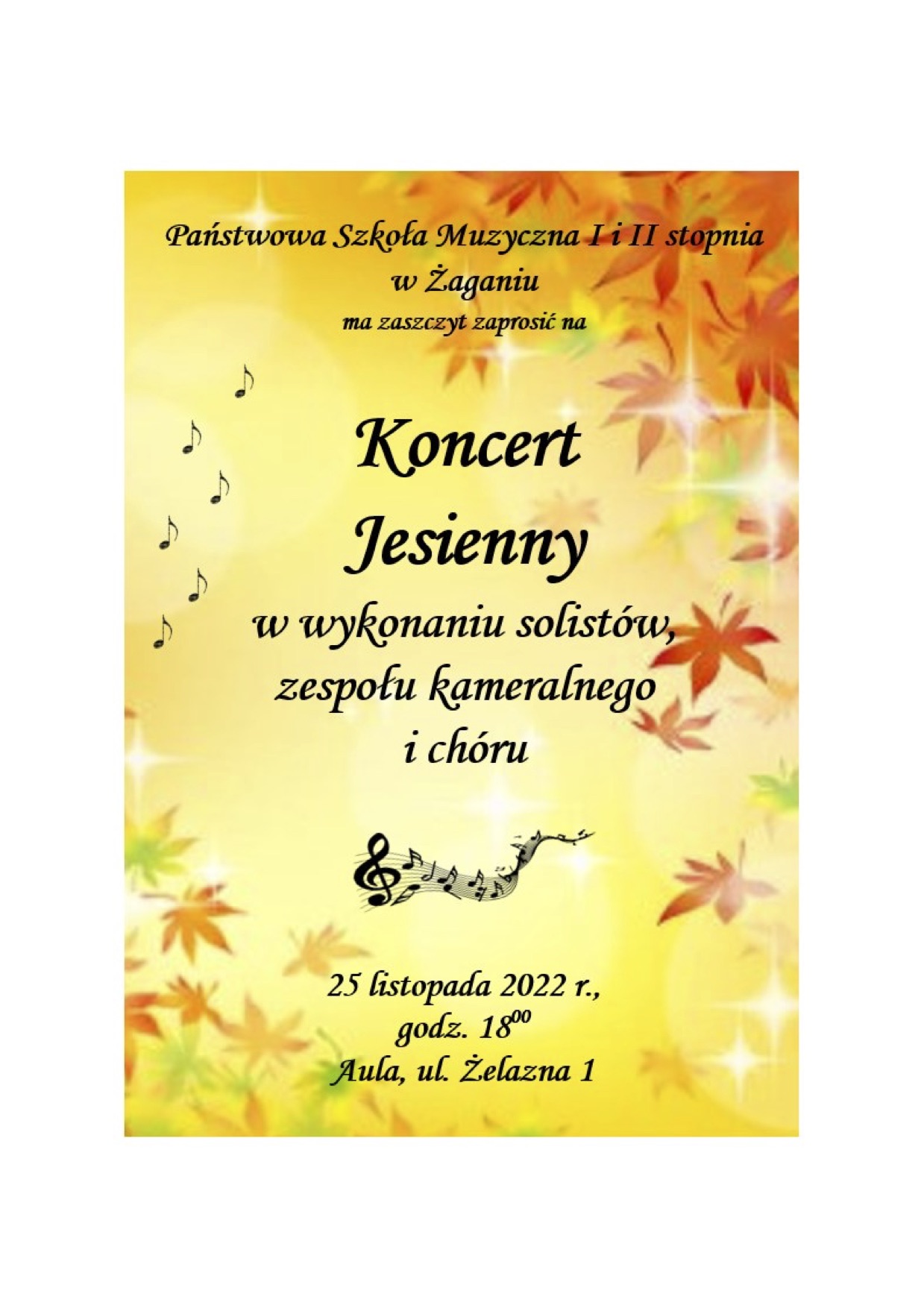 Państwowa Szkoła Muzyczna I i II stopnia w Żaganiu serdecznie zaprasza na Koncert Jesienny w wykonaniu solistów, zespołu kameralnego oraz chóru. Odbędzie się on w naszej Auli w budynku przy ul. Żelaznej 1. Zapraszamy w piątek, 25 listopada o godz. 18:00. Wstęp wolny.