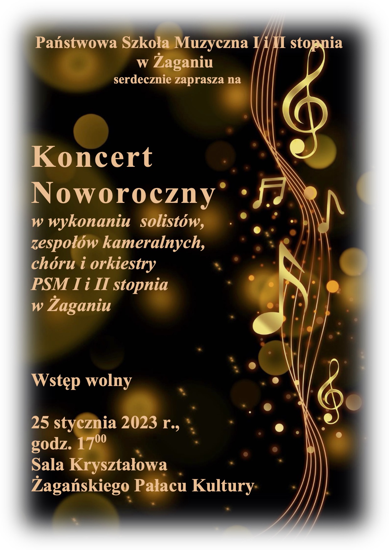 Państwowa Szkoła Muzyczna I i II stopnia w Żaganiu serdecznie zaprasza mieszkańców Żagania i okolic na Koncert Noworoczny w wykonaniu solistów, zespołów kameralnych, chóru i orkiestry szkolnej. Na koncert zapraszamy do Sali Kryształowej Żagańskiego Pałacu Kultury 25 stycznia (środa) o godz. 17:00. Wstęp wolny. Zapraszamy!