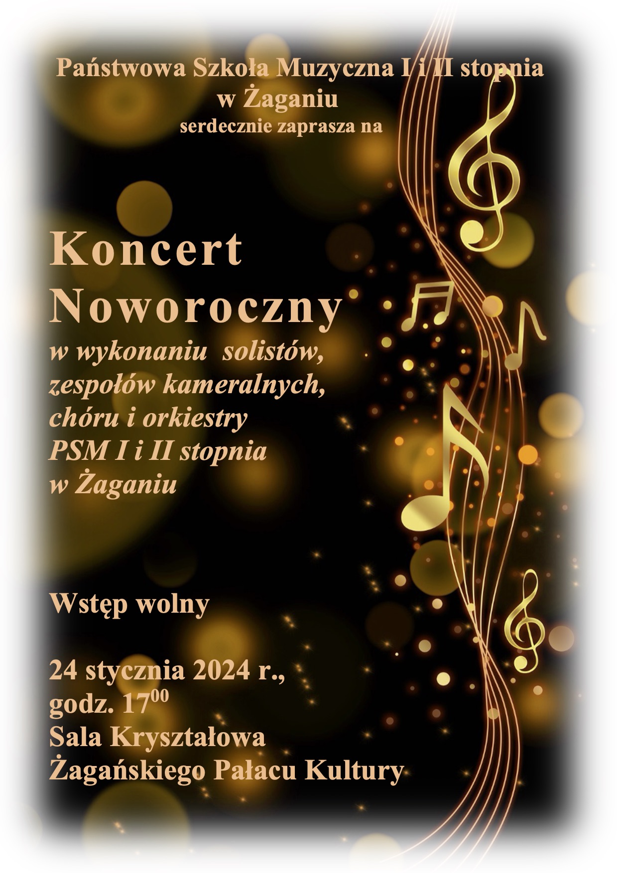 Państwowa Szkoła Muzyczna I i II stopnia w Żaganiu serdecznie zaprasza mieszkańców Żagania i okolic na Koncert Noworoczny w wykonaniu solistów, zespołów kameralnych, chóru i orkiestry szkolnej. Na koncert zapraszamy do Sali Kryształowej Żagańskiego Pałacu Kultury 24 stycznia (środa) o godz. 17:00. Wstęp wolny. Zapraszamy!
