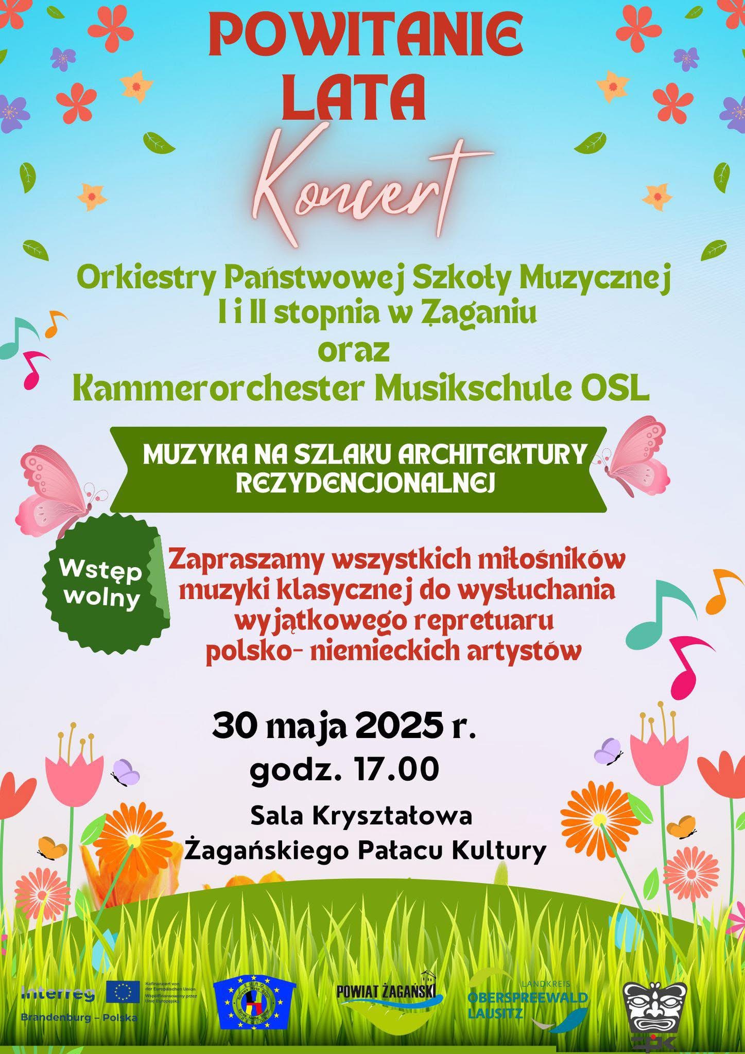 30 maja 2025 r. o godz. 17:00 zapraszamy do Sali Kryształowej Żagańskiego Pałacu Kultury na wyjątkowy koncert Powitanie lata w wykonaniu Orkiestry Państwowej Szkoły Muzycznej I i II stopnia w Żaganiu oraz Kammerorchester Musicschule OSL, który odbędzie się w ramach projektu: Muzyka na szlaku architektury rezydencjonalnej.Wstęp wolny. Serdecznie zapraszamy!