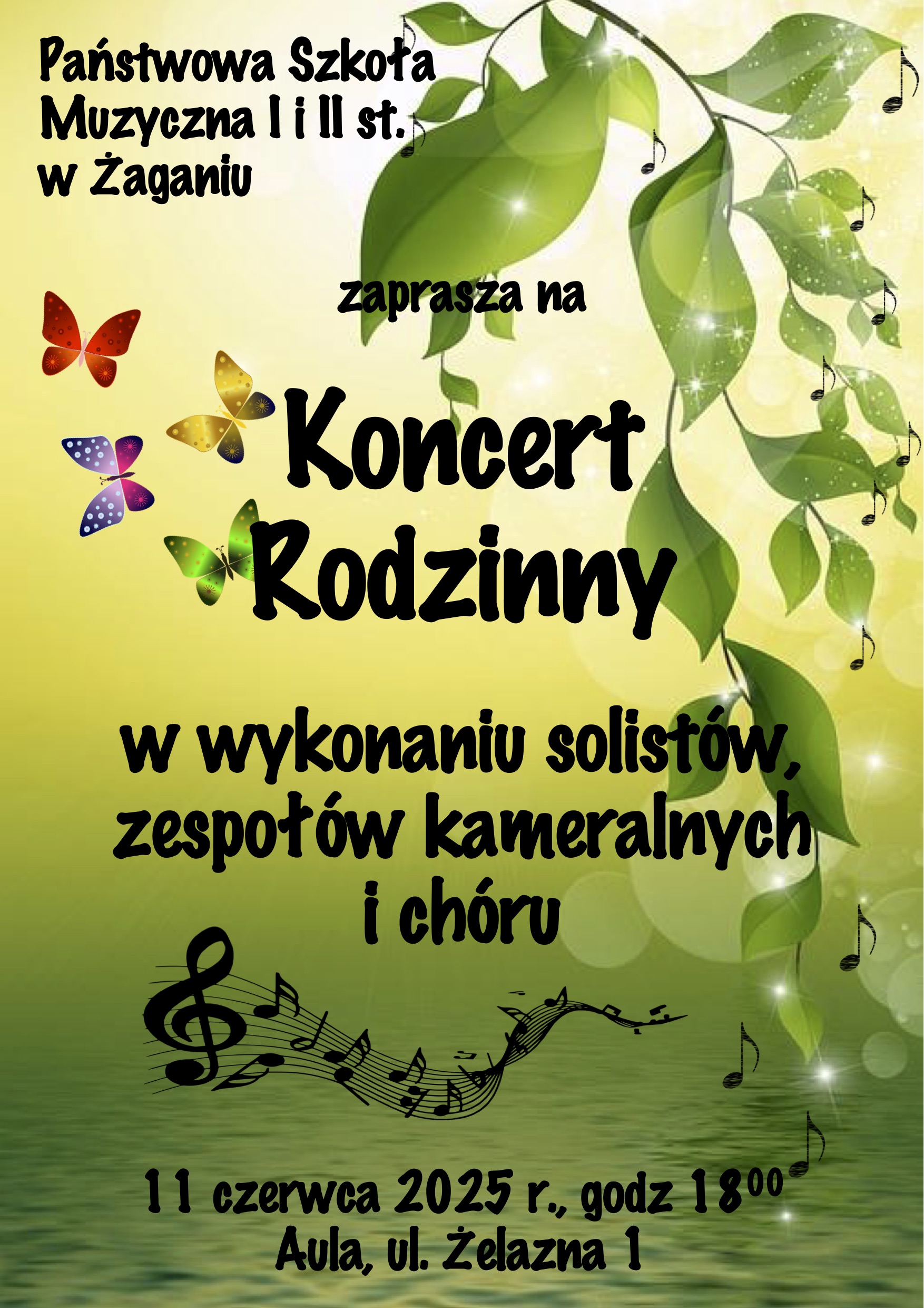 Państwowa Szkoła Muzyczna I i II stopnia w Żaganiu serdecznie zaprasza na Koncert Rodzinny w wykonaniu solistów, zespołów kameralnych oraz chóru. Odbędzie się on w naszej Auli w budynku przy ul. Żelaznej 1 w środę, 11 czerwca 2025 o godz. 18:00. Wstęp wolny.