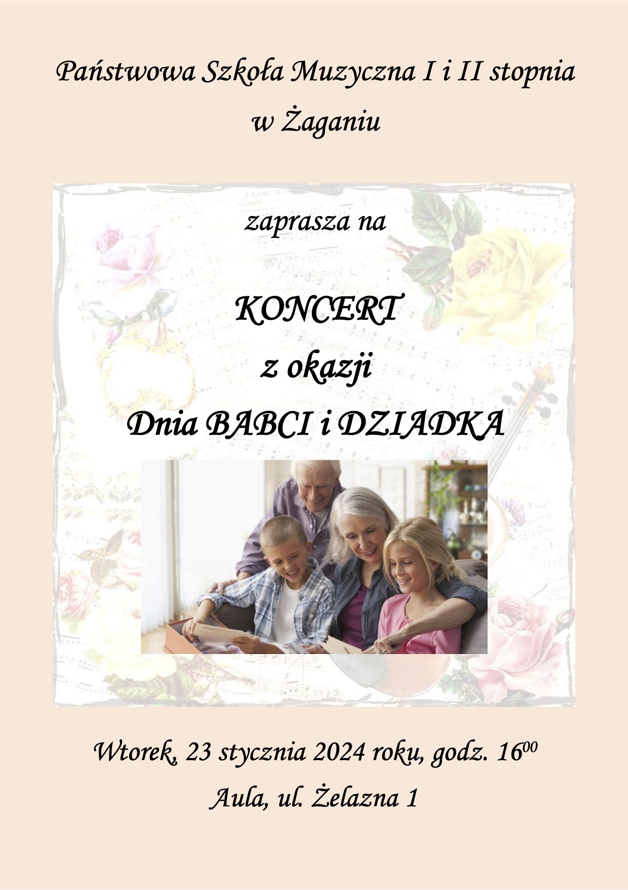 23 stycznia (wtorek) o godz. 16:00 zapraszamy Babcie i Dziadków na Koncert z okazji Dnia Babci i Dziadka. Koncert w wykonaniu naszych uczniów odbędzie sie w Auli szkoły przy ul. Żelaznej 1.