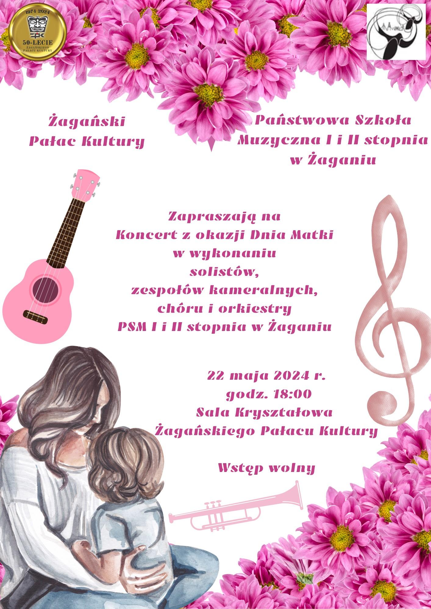 Państwowa Szkoła Muzyczna I i II stopnia w Żaganiu oraz Żagański Pałac Kultury serdecznie zapraszają mieszkańców Żagania i okolic na Koncert z okazji Dnia Matki w wykonaniu solistów, zespołów kameralnych, chóru i orkiestry szkolnej. Na koncert zapraszamy do Sali Kryształowej Żagańskiego Pałacu Kultury 22 maja (środa) o godz. 18:00. Wstęp wolny.