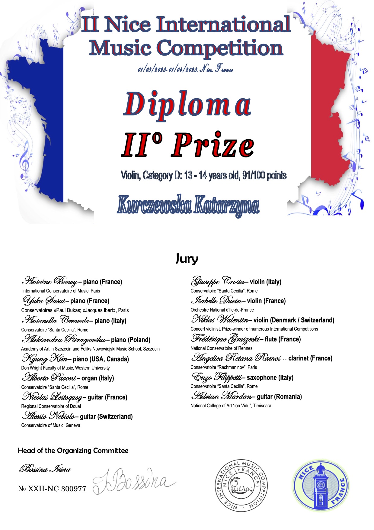 Dotarła do nas wspaniała informacja o sukcesie, jaki odniosła nasza uczennica klasy skrzypiec PSM II stopnia - Katarzyna Kurczewska. Tym razem wzięła ona udział w Międzynarodowym Konkursie Internetowym – II Nice International Music Competition – Francja. Konkurs polega na nagraniu kompozycji wykonanych na pamięć i przesłanie ich drogą internetową. W Konkursie nasza uczennica zdobyła II miejsce w kat. D: wiek 13-14 lat. Kasia uczy się w klasie skrzypiec mgr Wasyla Wierbickiego, podczas konkursowego nagrania, przy fortepianie towarzyszył jej mgr Wojciech Zawiślak. Serdecznie gratulujemy!