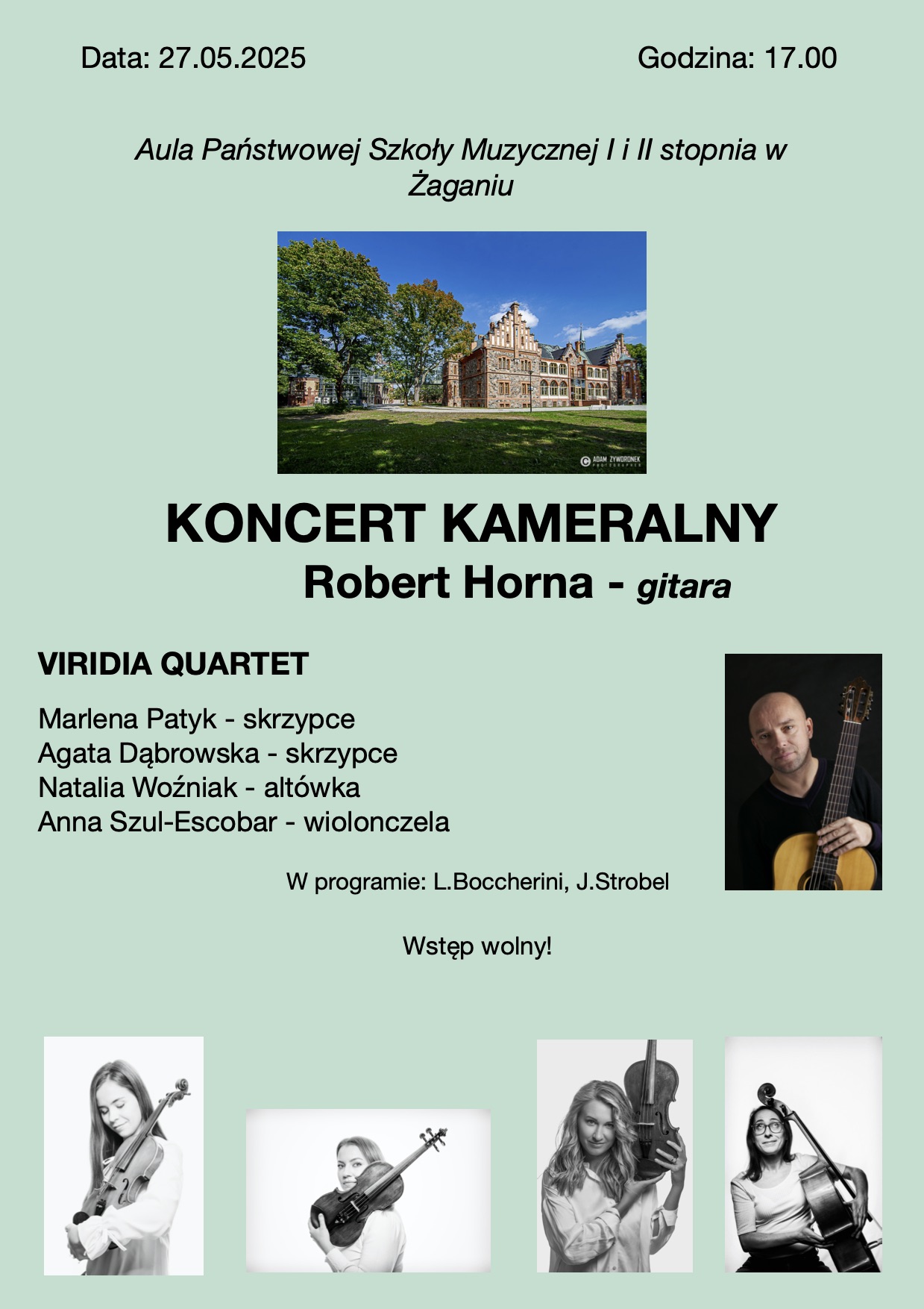 We wtorek, 27 maja br., o godz. 17.00 w Auli naszej szkoły odbędzie się nadzwyczajny koncert kameralny, którego bohaterem jest nasz nauczyciel – dr Robert Horna. Jako solista i kameralista (wraz z zespołem Viridia String Quartet) zaprezentuje m.in. Kwintet gitarowy Luigiego Boccheriniego oraz aranżacje utworów Janusza Strobla.
