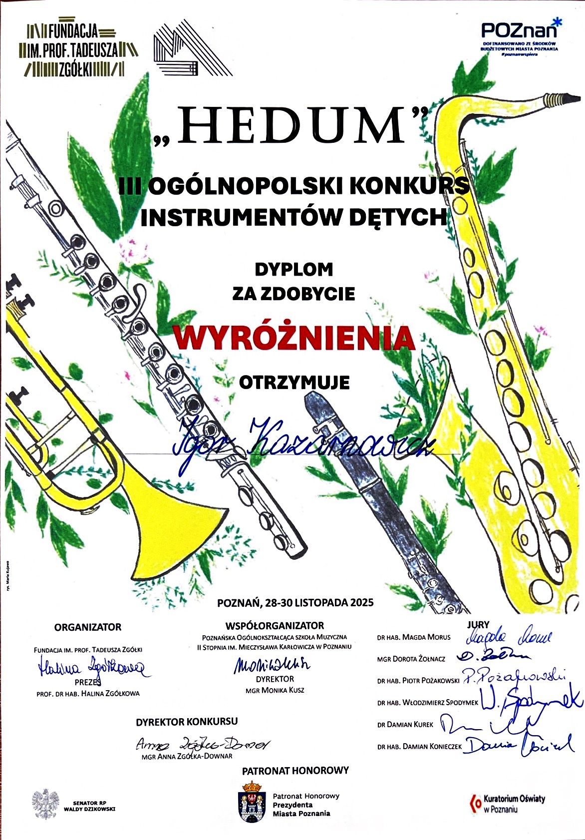 W dniach: 28-30 listopada 2025 r. w Sali Koncertowej Poznańskiej Ogólnokształcącej Szkoły Muzycznej II st. im. Mieczysława Karłowicza w Poznaniu odbywał się III Ogólnopolski Konkurs Instrumentów Dętych "HEDUM". Organizatorem Konkursu była Fundacja im. prof. Tadeusza Zgółki oraz Sekcja Instrumentów Dętych i Perkusji Poznańskiej Ogólnokształcącej Szkoły Muzycznej II stopnia im. Mieczysława Karłowicza. Konkurs był przeznaczony dla uczniów szkół muzycznych II stopnia oraz studentów wydziałów instrumentalnych uczelni muzycznych.Przesłuchania konkursowe dotyczyły instrumentów dętych drewnianych i blaszanych, odbywały się w trzech grupach: