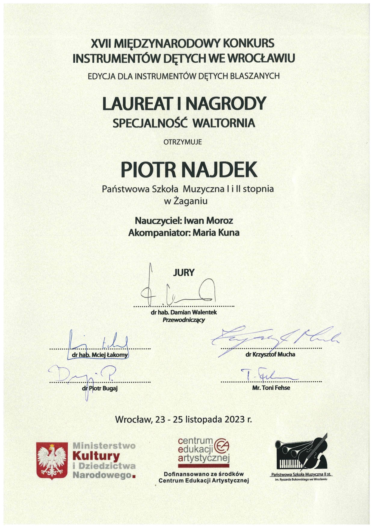 Dotarła do nas kolejna miła wiadomość – nasz waltornista okazał się być najlepszym w gronie młodych waltornistów – uczniów tej specjalności ze szkół muzycznych II stopnia w całej Polsce . W dniach 23. - 25. listopada odbywał się we Wrocławiu XVII Międzynarodowy Konkurs Instrumentów Dętych, którego organizatorem jest Centrum Edukacji Artystycznej, a współorganizatorem – Państwowa Szkoła Muzyczna II stopnia im. Ryszarda Bukowskiego we Wrocławiu. Konkurs przewidziany jest dla uczniów szkół muzycznych II stopnia w Polsce oraz dla uczniów równorzędnych szkół muzycznych za granicą z klas: trąbki, waltorni, puzonu i tuby. Znajduje się w Kalendarzu imprez szkolnictwa artystycznego. Jury – pod przewodnictwem dr. hab. Damiana Walentka (Akademia Muzyczna im. K. Szymanowskiego w Katowicach) w składzie: dr hab. Maciej Łakomy (Akademia Muzyczna im. I.J. Paderewskiego w Poznaniu), dr Piotr Bugaj (Akademia Muzyczna im. K. Lipińskiego we Wrocławiu), dr Krzysztof Mucha (Uniwersytet Muzyczny im. F. Chopina w Warszawie), Toni Fehse (Heinrich-Schütz-Konservatorium w Dreźnie) przyznało szereg nagród i wyróżnień, osobno w każdej specjalności. Piotr Najdek (uczeń klasy V PSM II stopnia w klasie mgr. Iwana Moroza) pokonał wszystkich waltornistów zdobywając I nagrodę. Piotrowi towarzyszyła na fortepianie mgr Maria Kuna. Gratulujemy!