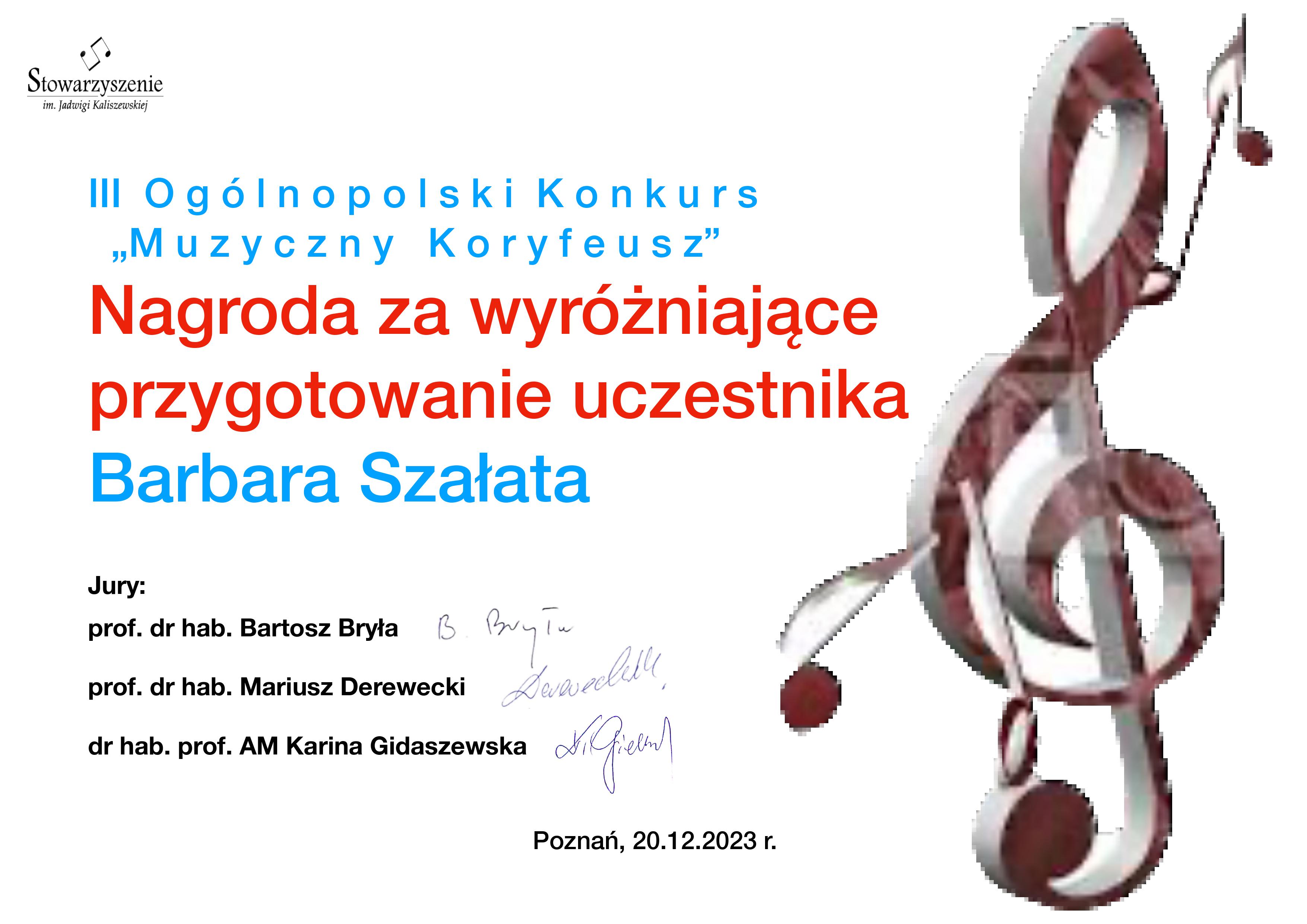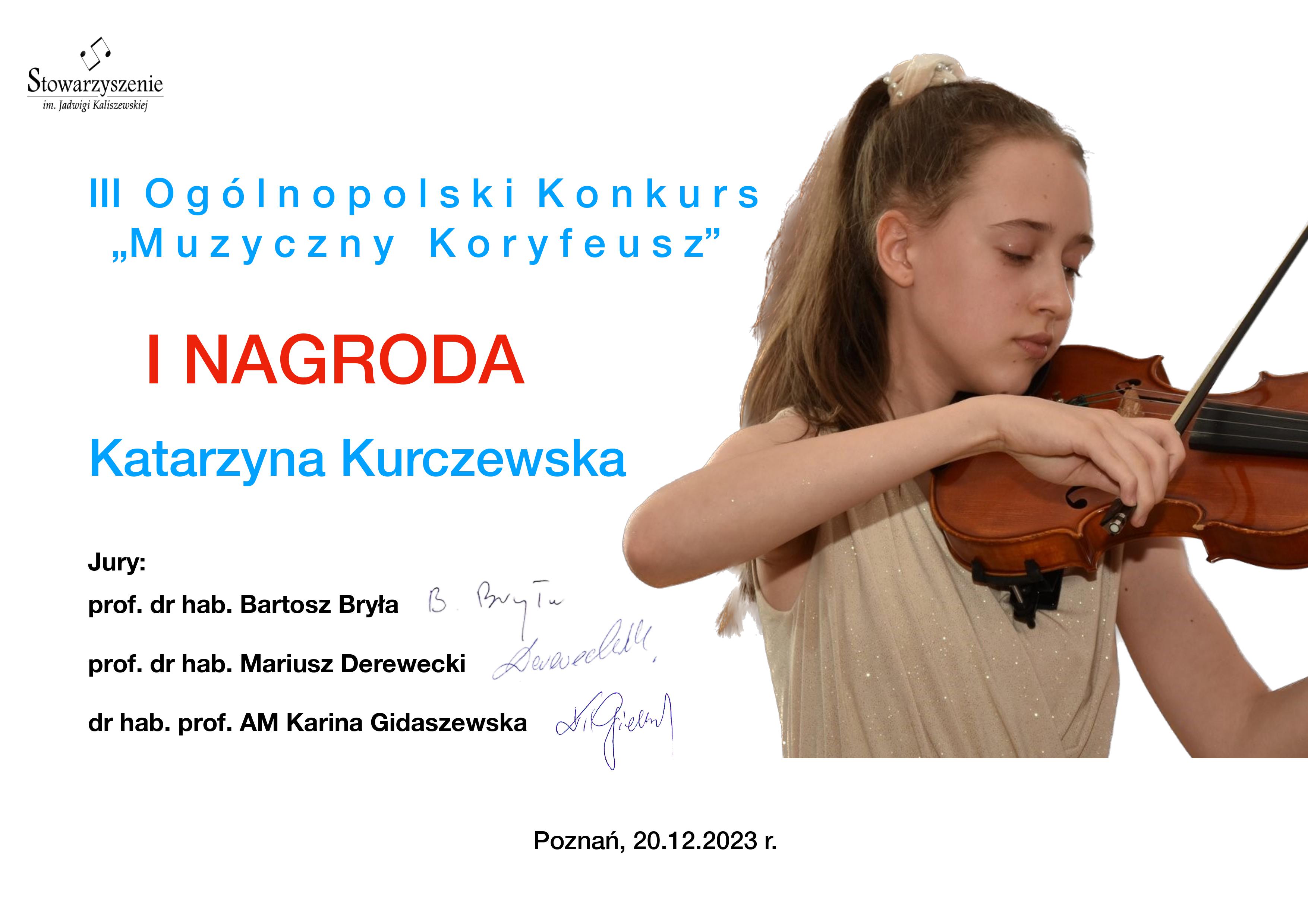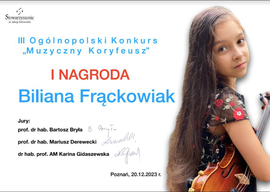 20 grudnia 2023 r. odbył się III Ogólnopolski Konkurs „Muzyczny Koryfeusz”. Organizatorem Konkursu było Stowarzyszenie im. Jadwigi Kaliszewskiej. Konkurs odbył się w formule on–line, a brali w nim udział skrzypkowie - uczniowie szkół muzycznych I i II stopnia w sześciu grupach wiekowych. W Jury konkursu zasiedli wybitni pedagodzy: prof. dr hab. Bartosz Bryła, prof. dr hab. Mariusz Derewecki oraz dr hab. prof. AM Karina Gidaszewska. Na Konkursie znakomicie zaprezentowały się nasze uczennice klasy skrzypiec – Biliana Frąckowiak – klasa mgr Barbary Szałaty oraz Katarzyna Kurczewska – klasa mgr Wasyla Wierbitskiego. Obie uczennice zdobyły I Nagrody w swoich grupach wiekowych. Dyplomy otrzymali także nasi nauczyciele: mgr Barbara Szałata za wyróżniające przygotowanie Biliany Frąckowiak oraz mgr Wojciech Zawiślak - za wyróżniającą partię fortepianu. Podczas nagrania konkursowego obu uczennicom na fortepianie towarzyszył mgr Wojciech Zawiślak. Gratulujemy!