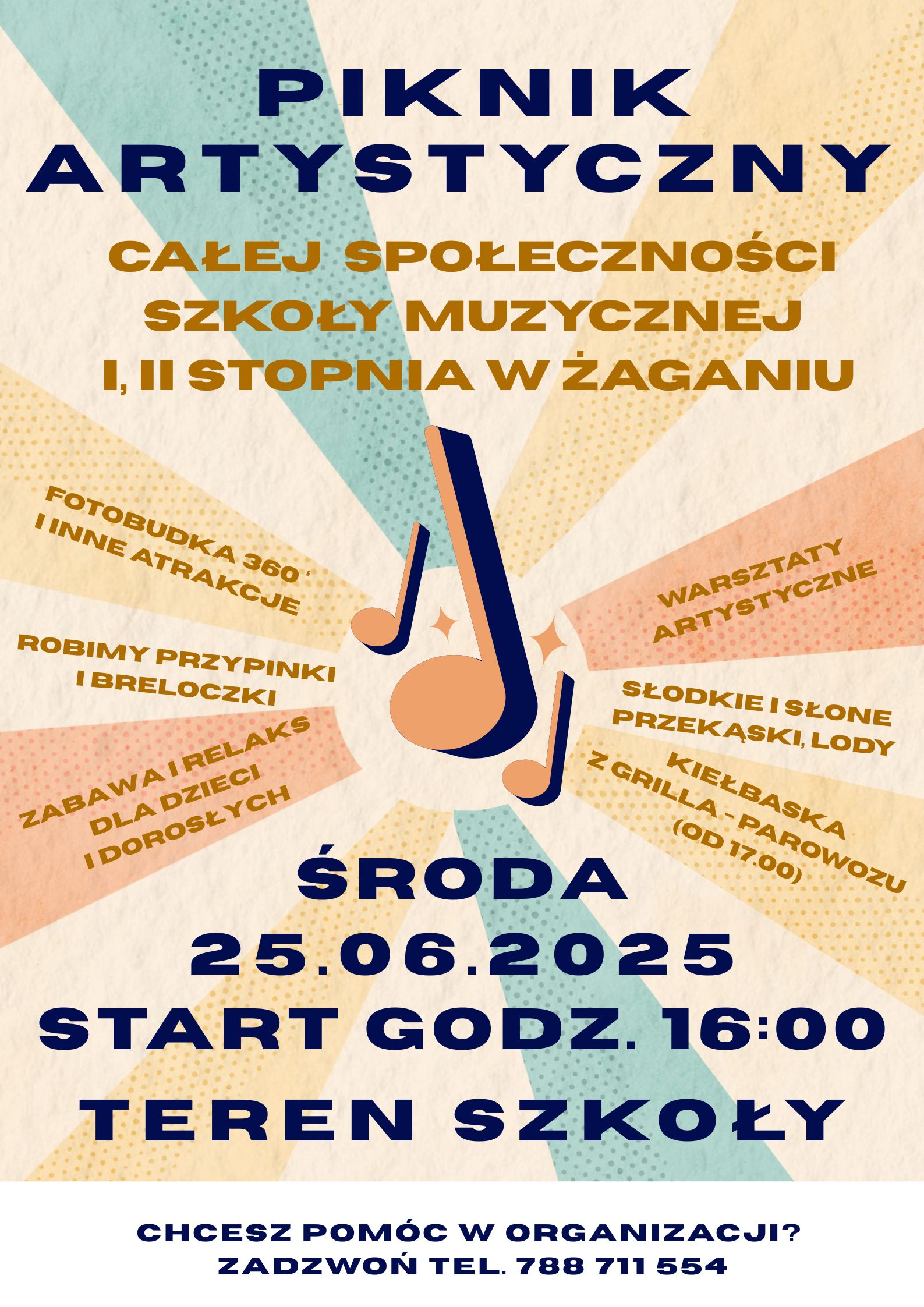 25 czerwca 2025 r. od godz. 16:00 zapraszamy uczniów, rodziców, nauczycieli na Piknik Artystyczny organizowany przez naszą Radę Rodziców. Do zobaczenia!