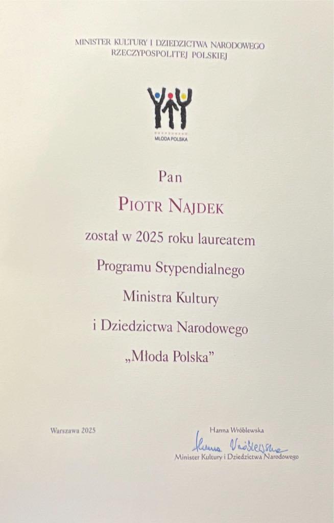 W minioną środę – 21 maja – na Zamku Królewskim w Warszawie odbyła się niezwykle miła uroczystość, w której uczestniczył nasz uczeń – Piotr Najdek (klasa VI PSM II st., podopieczny mgr. Iwana Moroza). Z rąk Hanny Wróblewskiej, Ministra Kultury i Dziedzictwa Narodowego, odebrał on dyplom potwierdzający przyznane mu stypendium XXII edycji Programu "Młoda Polska". Znalazł się wśród 102 twórców i artystów (reprezentujących kategorie: muzyka, sztuki wizualne, film, teatr, 3 taniec i literatura).
