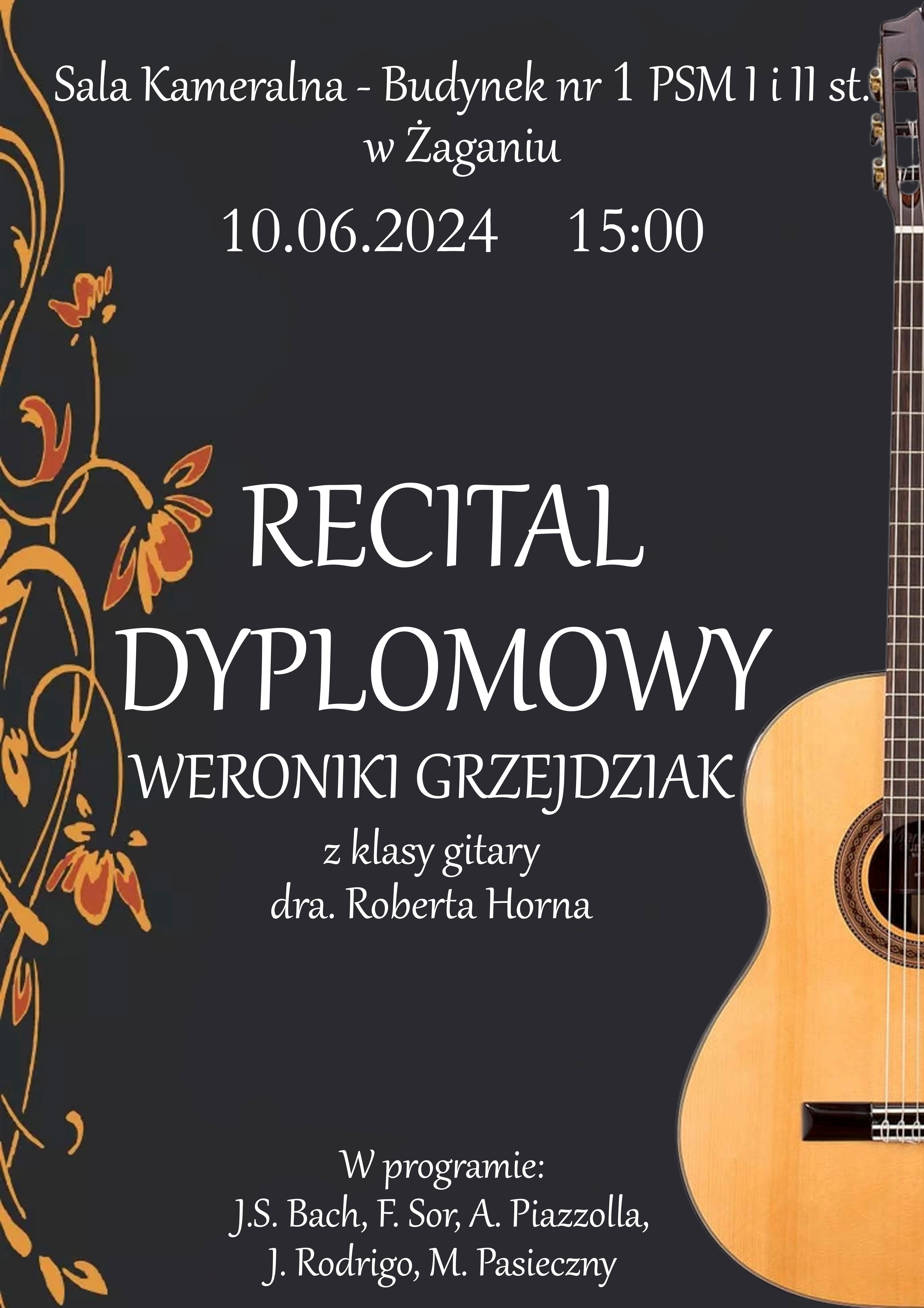 10 czerwca 2024 r. w naszej szkole odbędą się otwarte dla publiczności Recitale dyplomowe uczniów klasy VI PSM II stopnia: