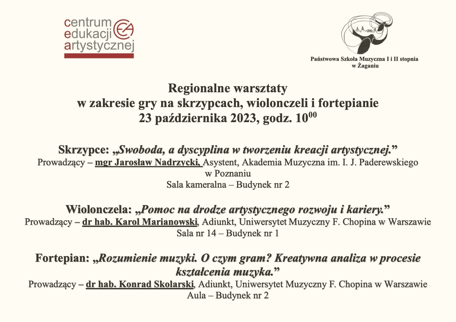 23 października 2023 r. odbędą się w naszej szkole Regionalne warsztaty w zakresie gry na skrzypcach, wiolonczeli i fortepianie: