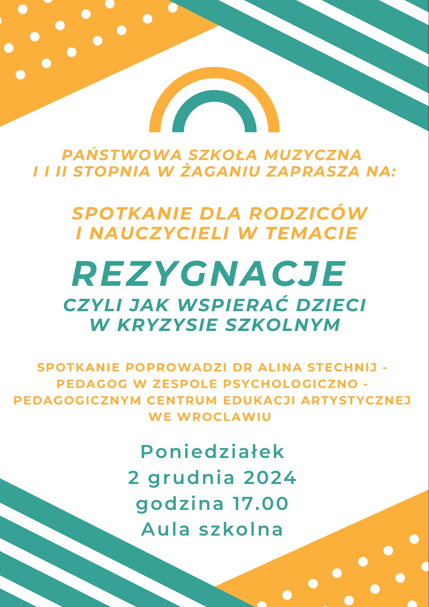 2 grudnia 2024 r. o godz. 17:00 w Auli naszej szkoły odbędzie się spotkanie z pedagogiem Zespołu Psychologiczno-Pedagogicznego Centrum Edukacji Artystycznej we Wrocławiu dr Aliną Stechnij. Zapraszamy na spotkanie rodziców i nauczycieli - temat spotkania: Rezygnacje, czyli jak wspierać dzieci w kryzysie szkolnym.