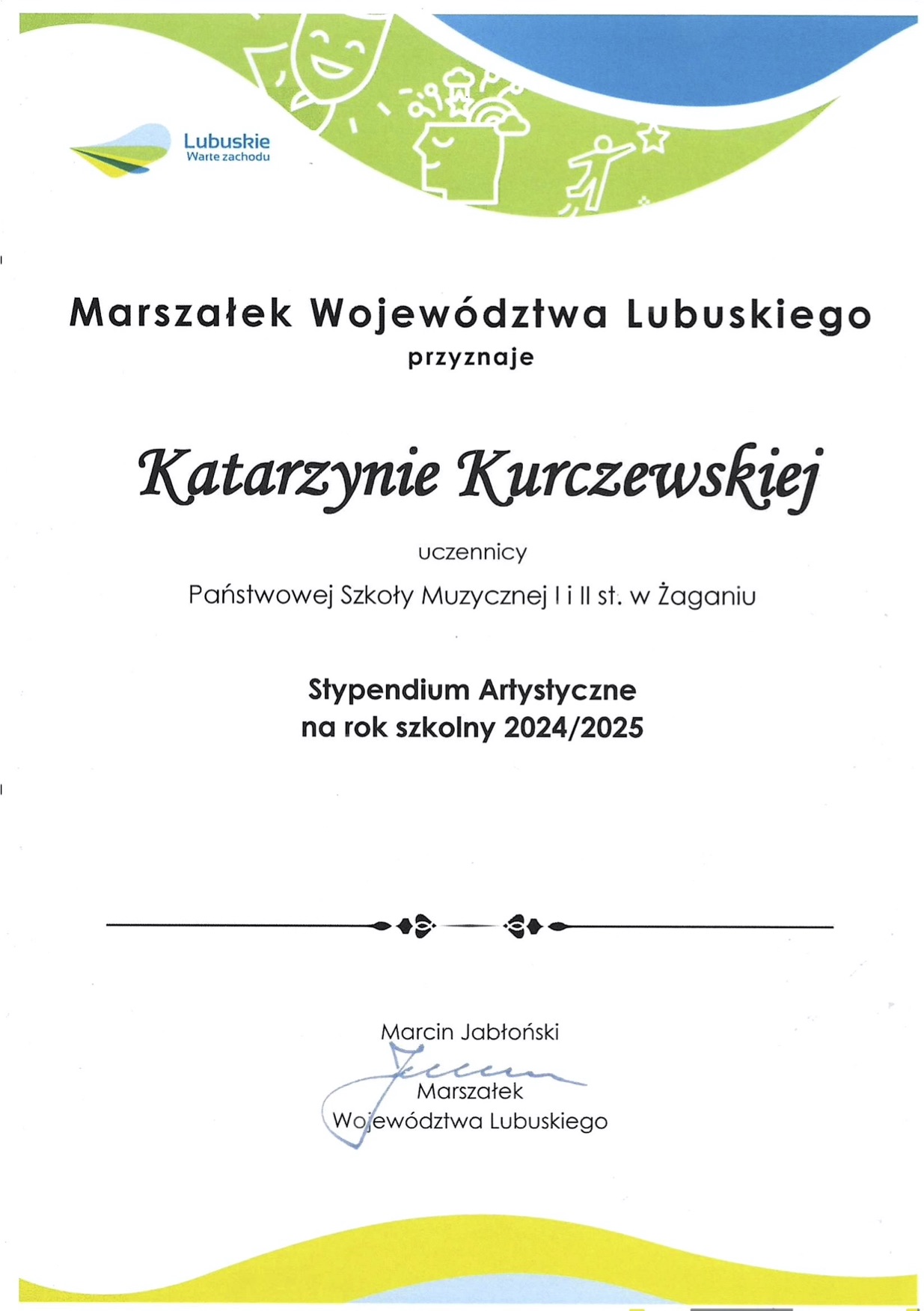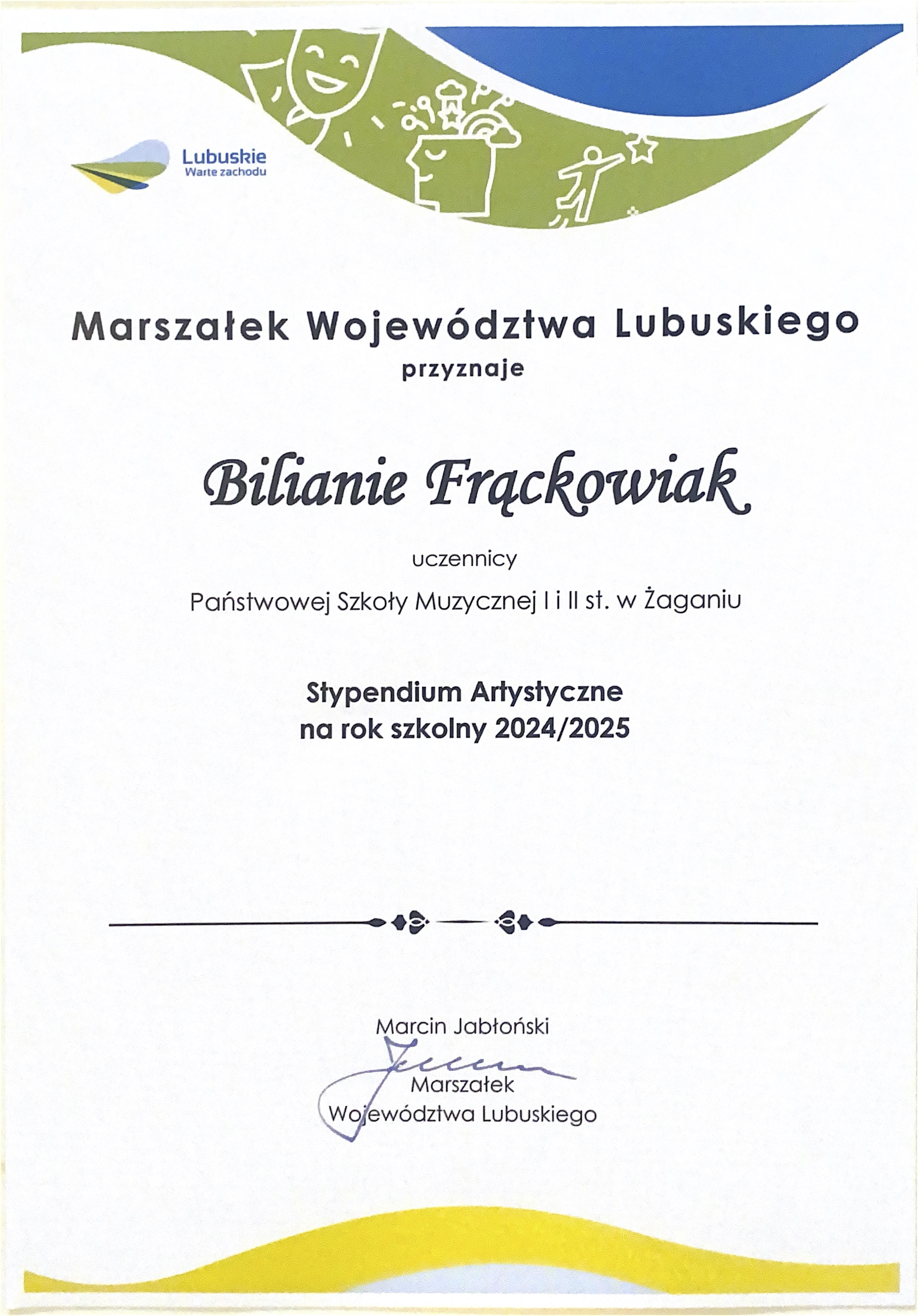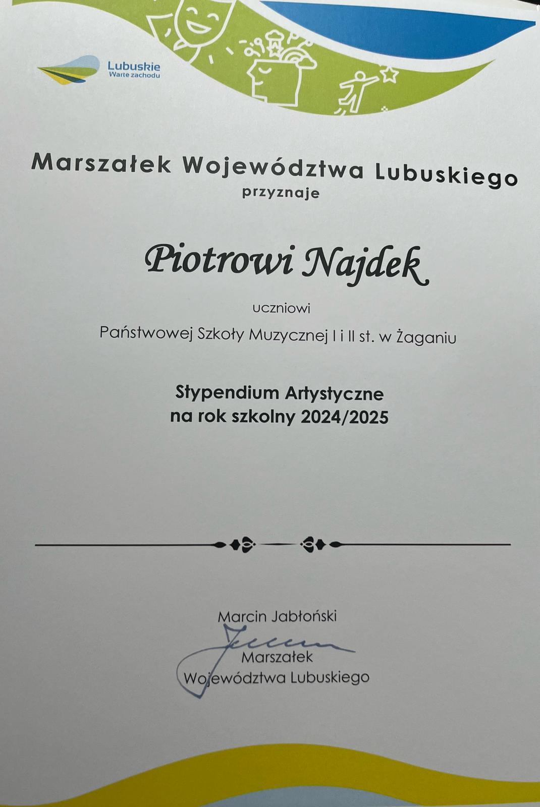 W roku szkolnym 2024/2025 stypendium Marszałka Województwa Lubuskiego otrzymało 25 osób: 9 uczniów a kategorii stypendiów naukowych, 1 uczeń – w kategorii stypendiów twórczych oraz 15 uczniów - w kategorii stypendiów artystycznych. Z satysfakcją informujemy, że w gronie stypendystów znaleźli się nasi uczniowie: po raz pierwszy - skrzypaczka - Biliana Frąckowiak (klasa IV PSM I stopnia), podopieczna mgr. Wasyla Wierbickiego, już po raz siódmy - Katarzyna Kurczewska - (klasa III PSM II st.) - także z klasy skrzypiec mgr. Wasyla Wierbickiego oraz - po raz drugi - waltornista - Piotr Najdek (klasa VI PSM II st.) - wychowanek mgr. Iwana Moroza. To również niezwykły sukces naszej szkoły, zwłaszcza, gdy dodamy, iż stypendium artystyczne po raz kolejny wręczono także naszej dawnej uczennicy - Joannie Habich (kontynuującej obecnie edukację w klasie skrzypiec Poznańskiej Szkoły Talentów).