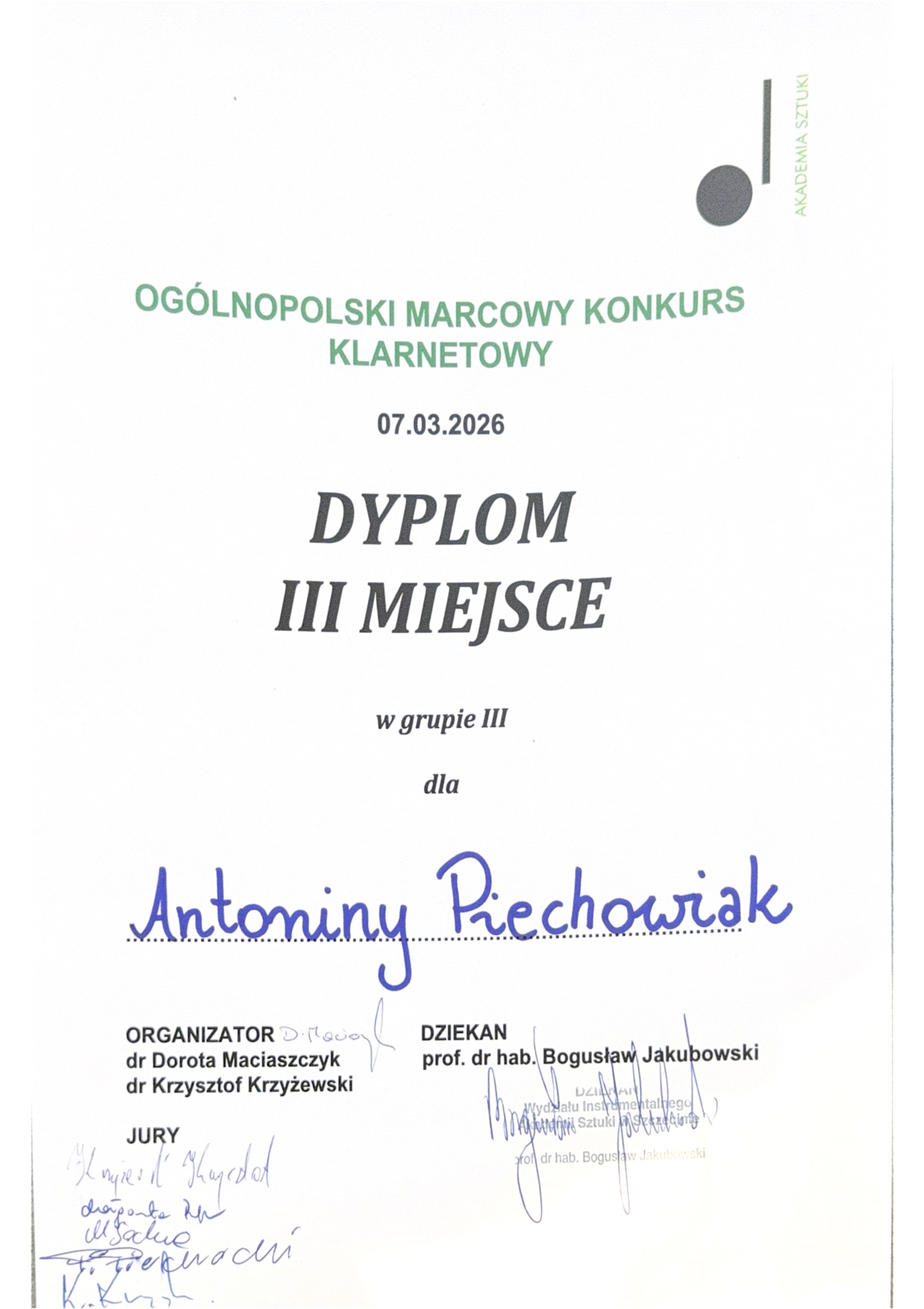 7 marca 2026 roku w Sali Perłowej Pałacu Ziemstwa Pomorskiego w Szczecinie odbył się Marcowy Konkurs Klarnetowy. W Konkursie brali udział uczniowie szkół muzycznych I i II stopnia z całej Polski w następujących kategoriach: