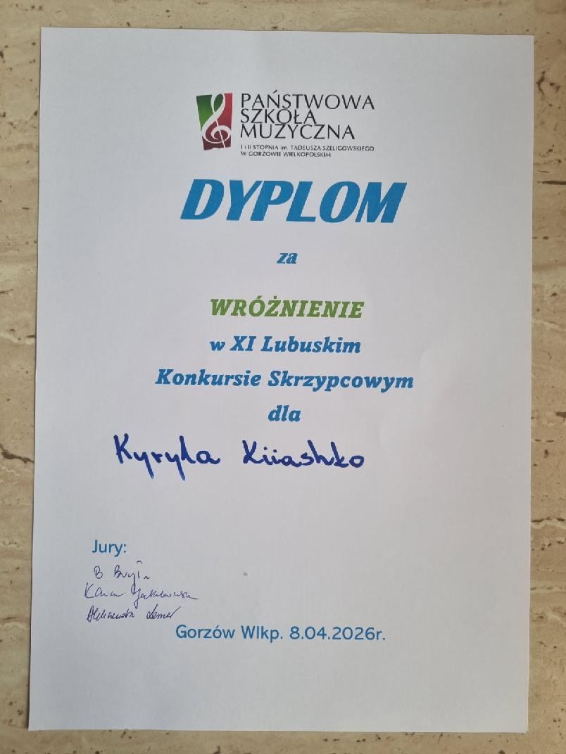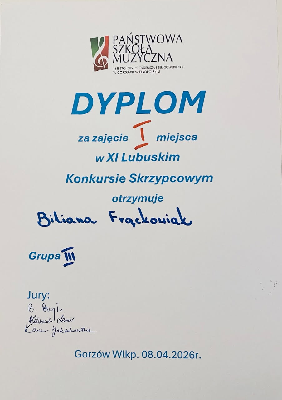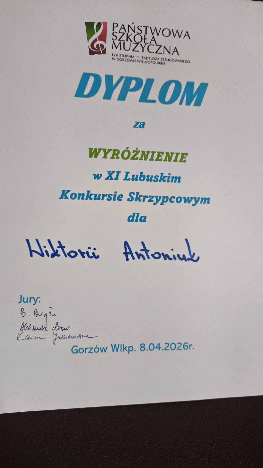Na Konkursie bardzo dobrze zaprezentowali się nasi skrzypkowie PSM I stopnia: Wiktoria Antoniuk i Kyryl Kiiashko - klasa I/6, Julia Grzelec - klasa III/6 - uczniowie mgr Ireny Zapolskiej oraz Biliana Frąckowiak, klasa V/6 pracująca pod kierunkiem mgr Wasyla Wierbickiego. Wiktoria Antoniuk i Kyryl Kiiashko zdobyli Wyróżnienia w Grupie I, natomiast Biliana Frąckowiak - I miejsce w Grupie III. Podczas występu konkursowego naszym uczniom na fortepianie towarzyszył mgr Wojciech Zawiślak. Serdecznie gratulujemy!!!