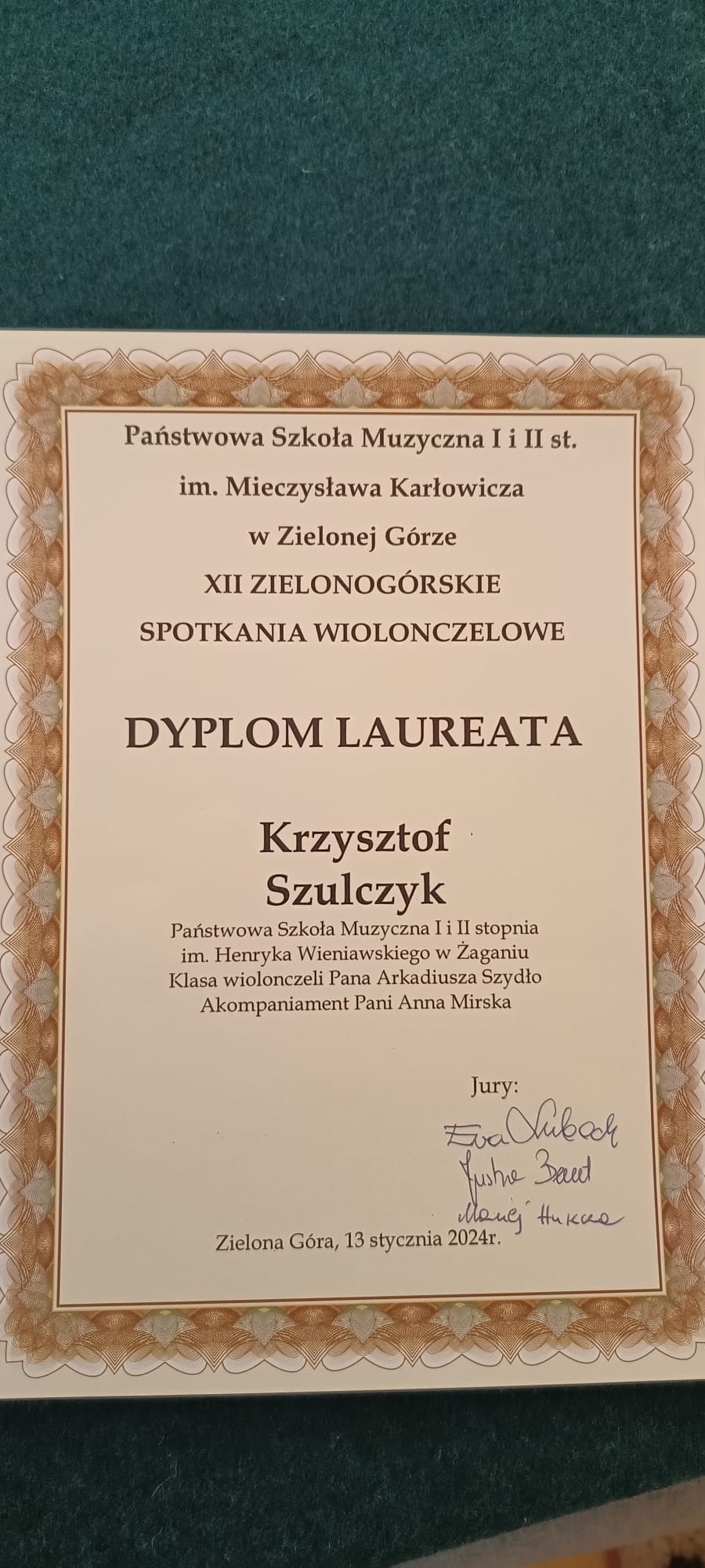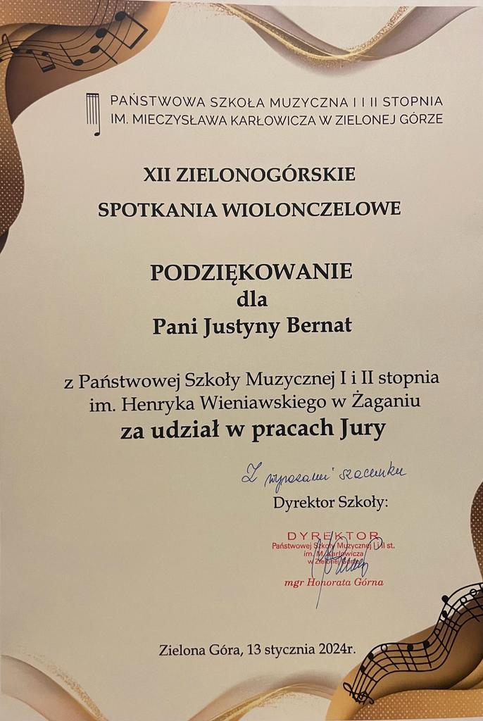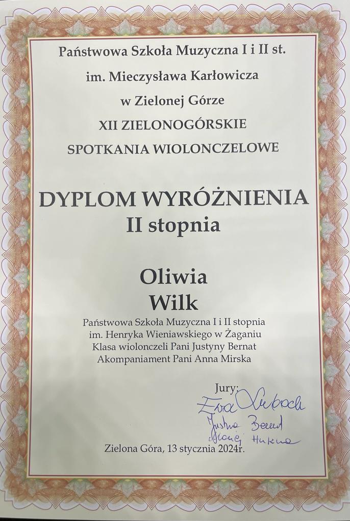 13 stycznia 2024 r. w Państwowej Szkole Muzycznej I i II stopnia im. Mieczysława Karłowicza w Zielonej Górze odbyły się XII Zielonogórskie Spotkania Wiolonczelowe. Młodzi wiolonczeliści rywalizowali w czterech grupach wiekowych: