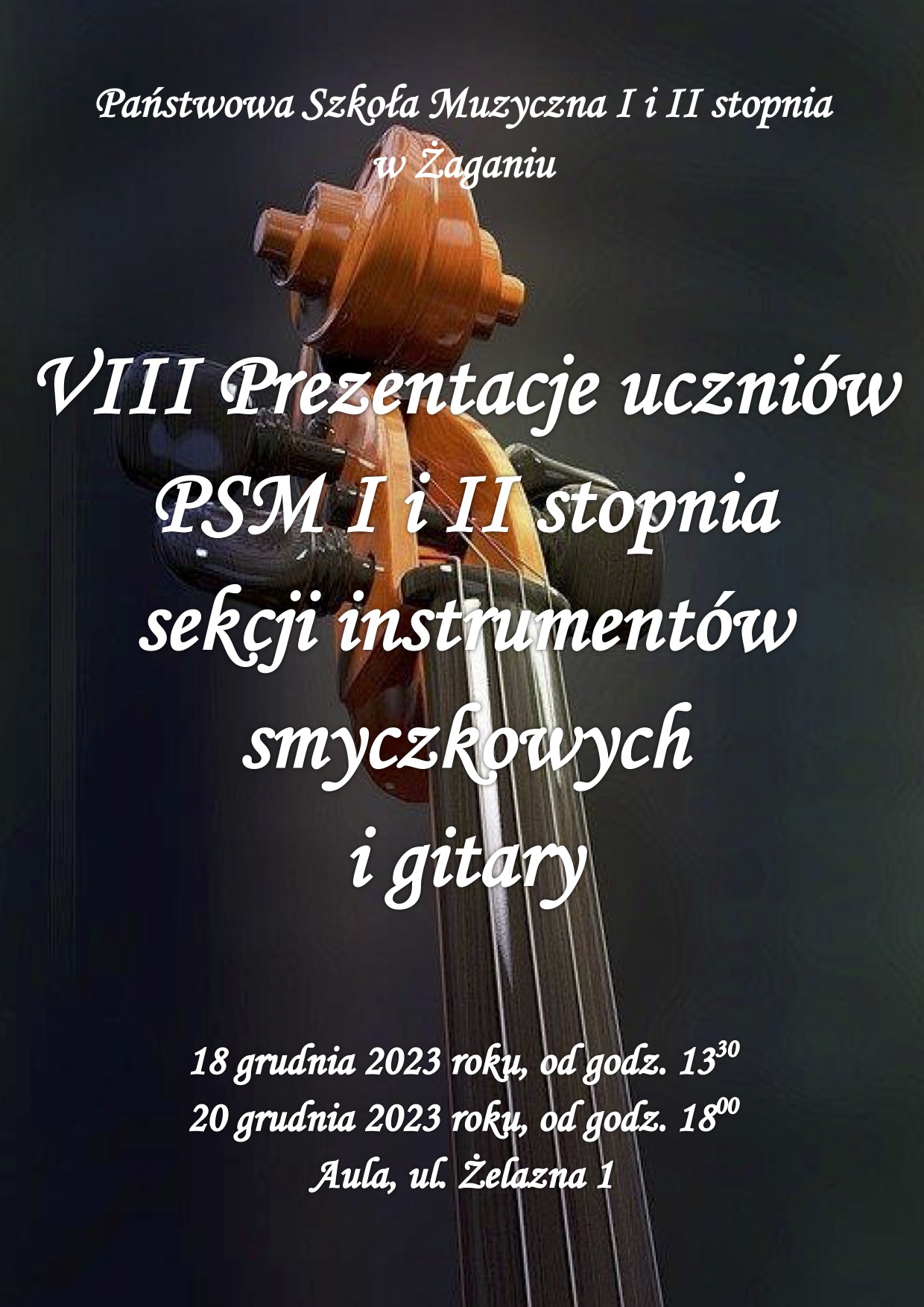 18 grudnia 2023 (poniedziałek) od godz. 13.30 oraz 20 grudnia 2023 (środa) od godz. 18:00 w Auli przy ul. Żelaznej 1,odbędą się VIII Prezentacje uczniów PSM I i II stopnia sekcji instrumentów smyczkowych i gitary. W poniedziałek wystąpią skrzypkowie, gitarzyści i wiolonczeliści - uczniowie PSM I stopnia, natomiast w środę skrzypkowie i altowioliści - uczniowie PSM II stopnia. Prezentacje są otwarte dla publiczności - zapraszamy w najbliższy poniedziałek do naszej Auli.