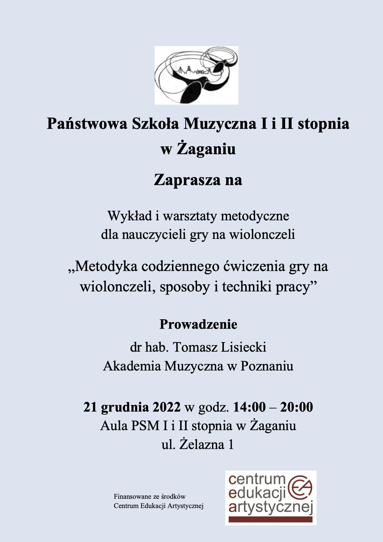 21 grudnia 2022 od godz. 14:00 w Auli PSM I i II stopnia w Żaganiu ul. Żelazna 1 odbędą się Warsztaty metodyczne dla nauczycieli gry na wiolonczeli pt. „Metodyka codziennego ćwiczenia gry na wiolonczeli, sposoby i techniki pracy”. Warsztaty poprowadzi dr hab. Tomasz Lisiecki - Akademia Muzyczna w Poznaniu. Serdecznie zapraszamy!