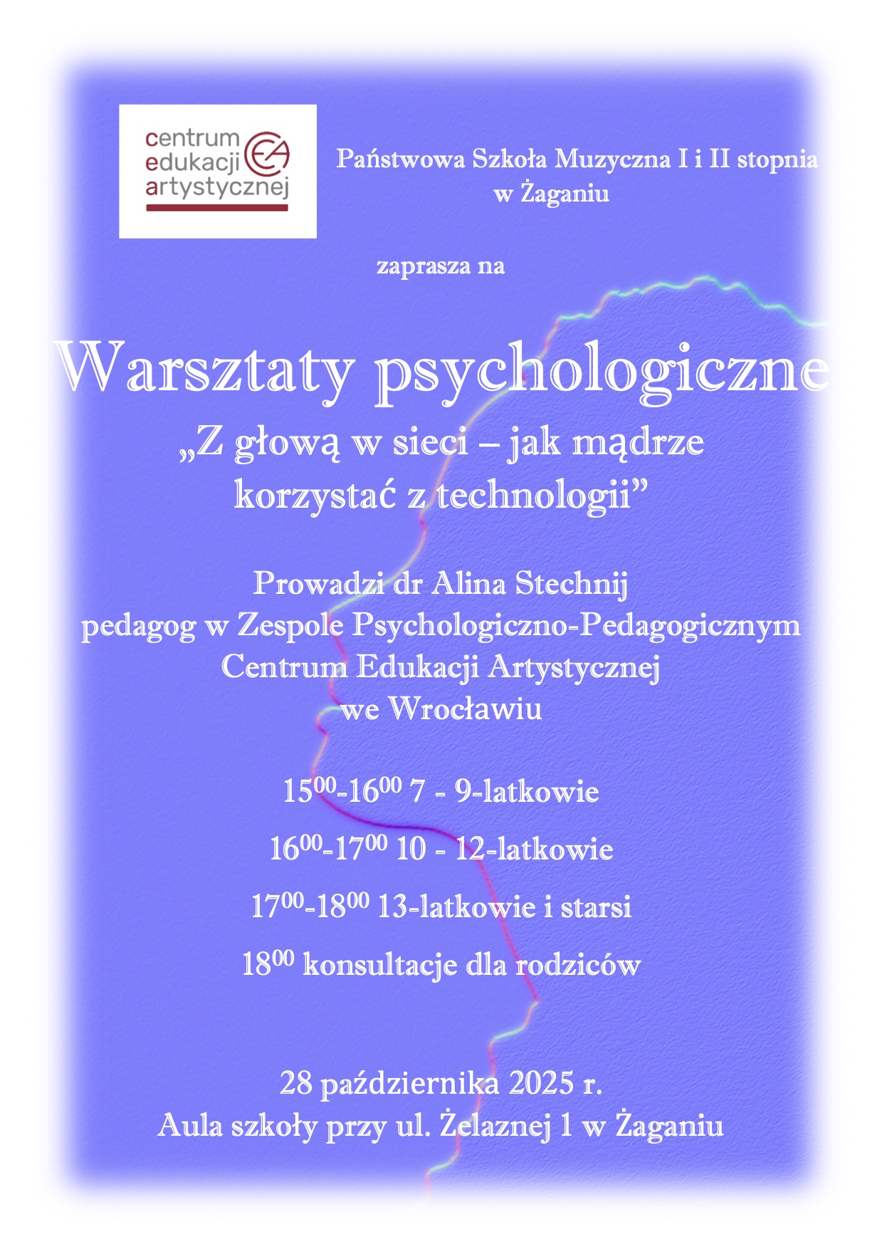We wtorek - 28 października 2025 r. zapraszamy do naszej Auli uczniów na Warsztaty pt. „Z głową w sieci – jak mądrze korzystać z technologii”. Zajęcia będzie prowadziła dr Alina Stechnij pedagog w Zespole Psychologiczno-Pedagogicznym Centrum Edukacji Artystycznej we Wrocławiu. Szczegóły spotkania na plakacie - serdecznie zapraszamy!