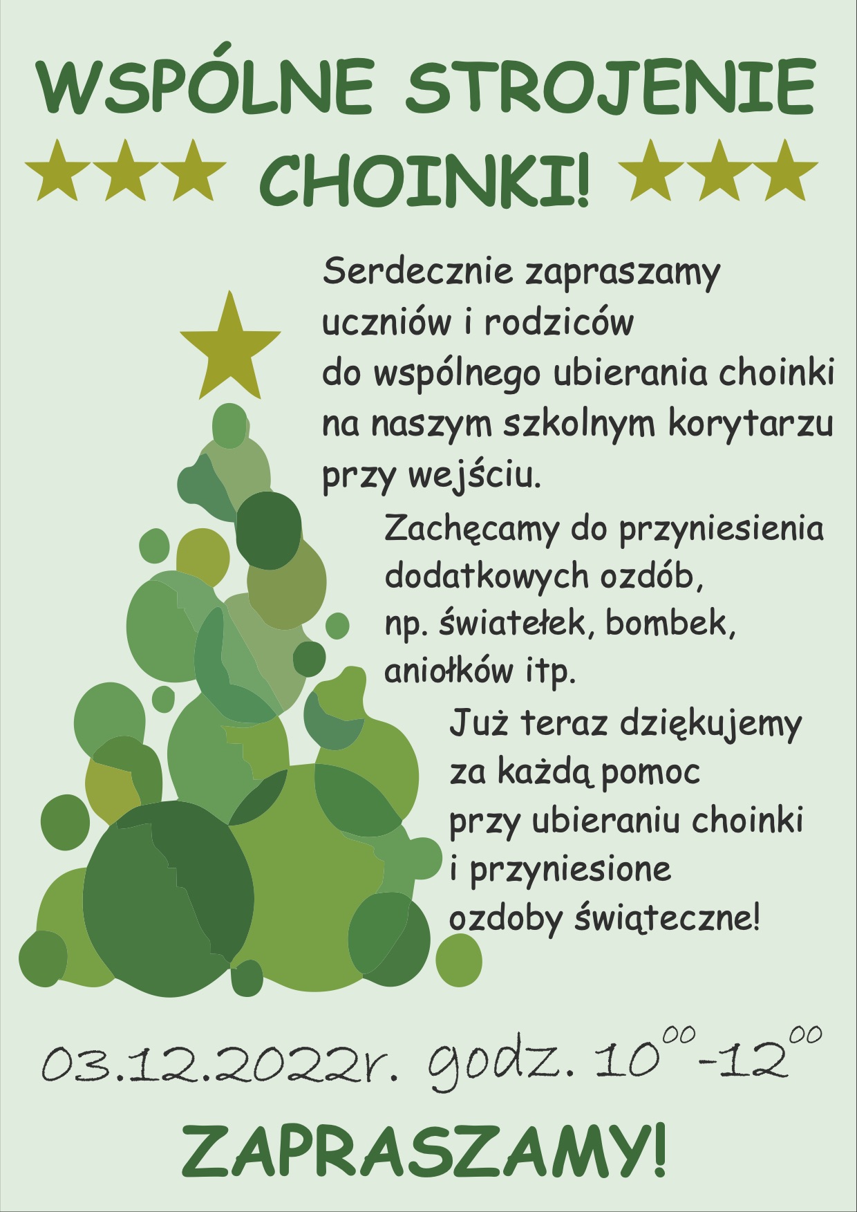 Serdecznie zapraszamy uczniów i rodziców do wspólnego ubierania choinki na naszym szkolnym korytarzu przy wejściu - 03.12.2022 godz.10:00 - 12:00. Zachęcamy do przyniesienia dodatkowych ozdób np. światełek, bombek, aniołków itp. Juz teraz dziękujemy za każdą pomoc przy ubieraniu choinki i przyniesione ozdoby świąteczne.