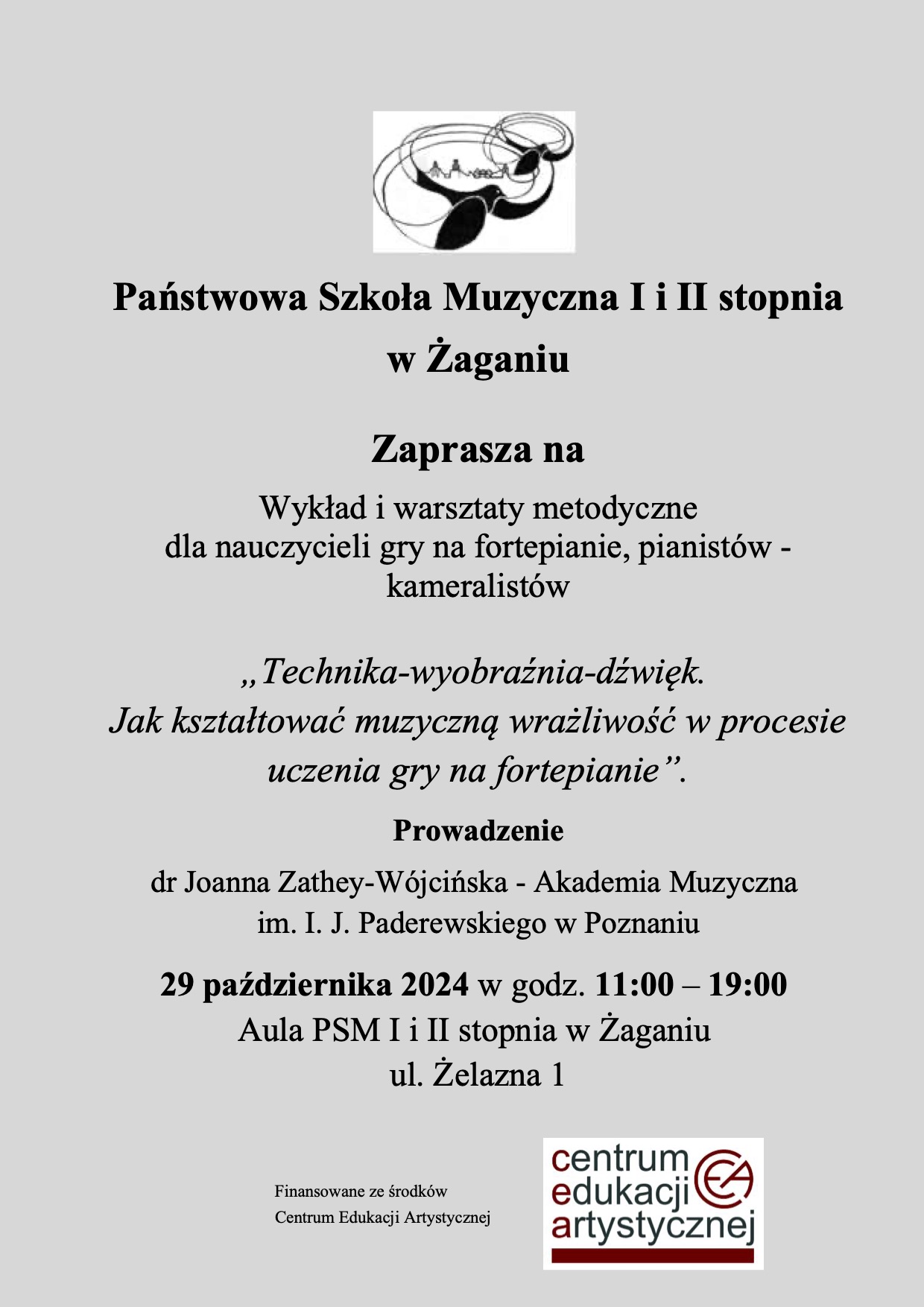 Sekcja fortepianu PSM I i II stopnia w Żaganiu zaprasza na Warsztaty fortepianowe, które odbędą 29 października 2024 r. w naszej szkole. W ramach spotkania przewidziany jest wykład pt. „Technika-wyobraźnia-dźwięk. Jak kształtować muzyczną wrażliwość w procesie uczenia gry na fortepianie”. Warsztaty poprowadzi dr Joanna Zathey-Wójcińska - Akademia Muzyczna im. Ignacego Jana Paderewskiego w Poznaniu. Zapraszamy we wtorek, 29 października 2024 r. od godz. 11:00 - Aula szkoły przy ul. Żelaznej 1 w Żaganiu.
