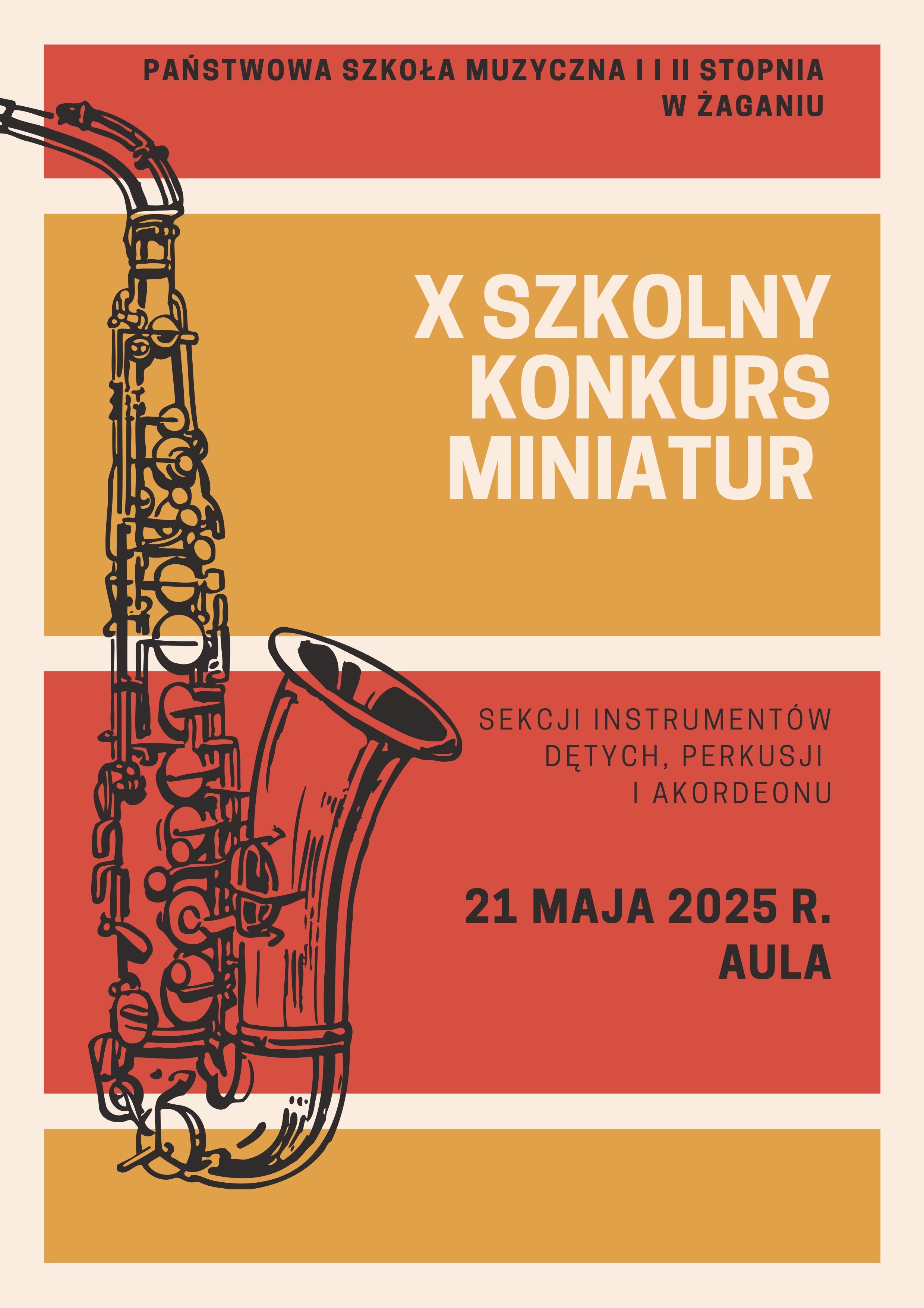 21 maja 2025 r. (środa) o godz. 16:00 w Auli naszej szkoły rozpocznie się X Szkolny Konkurs Miniatur uczniów PSM I i II stopnia sekcji instrumentów dętych, perkusji i akordeonu. Zapraszamy serdecznie!