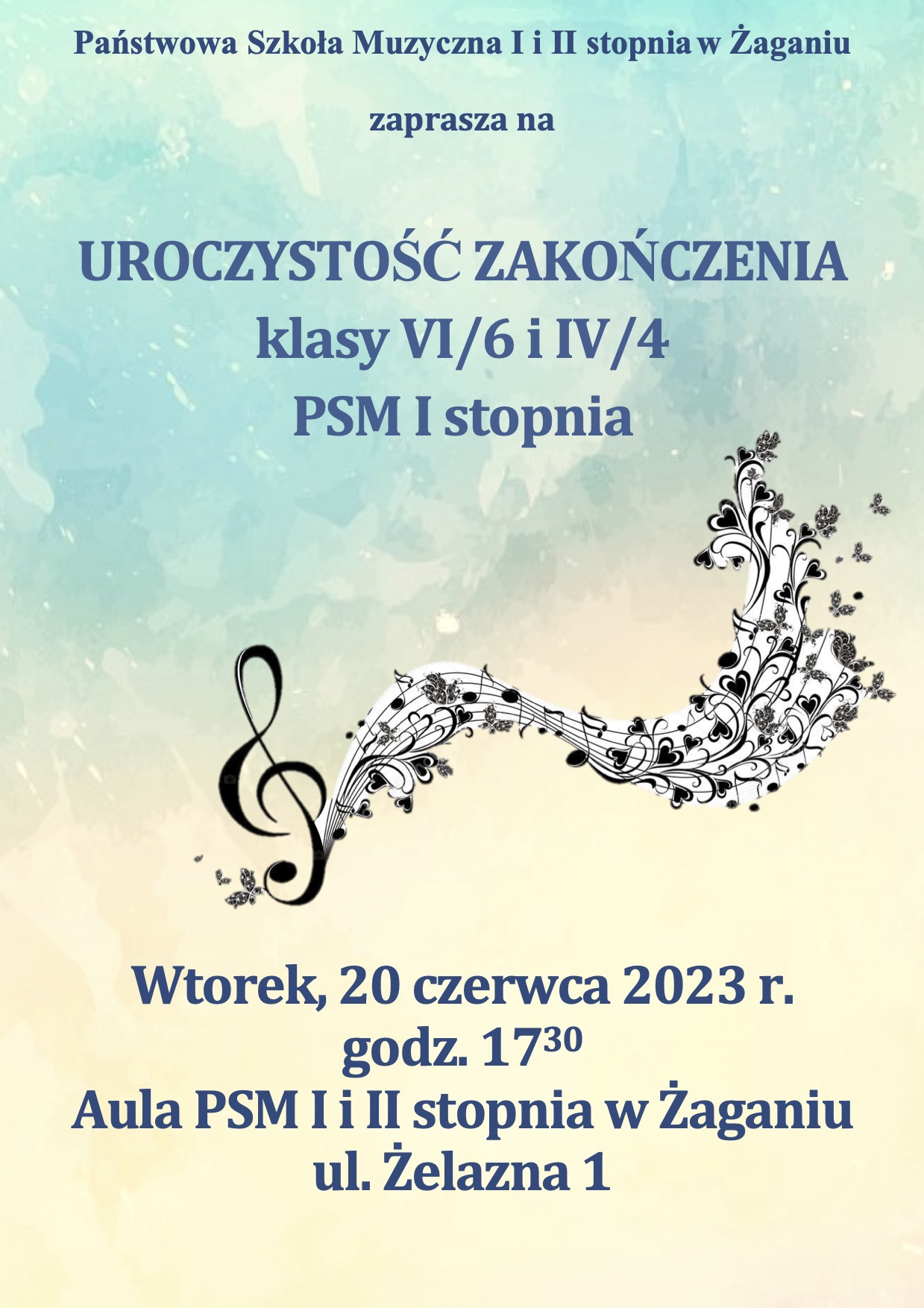20 czerwca 2023 (wtorek) o godz. 17:30 zapraszamy do Auli naszej szkoły na Uroczystość zakończenia PSM I stopnia połączoną z Koncertem Absolwentów.