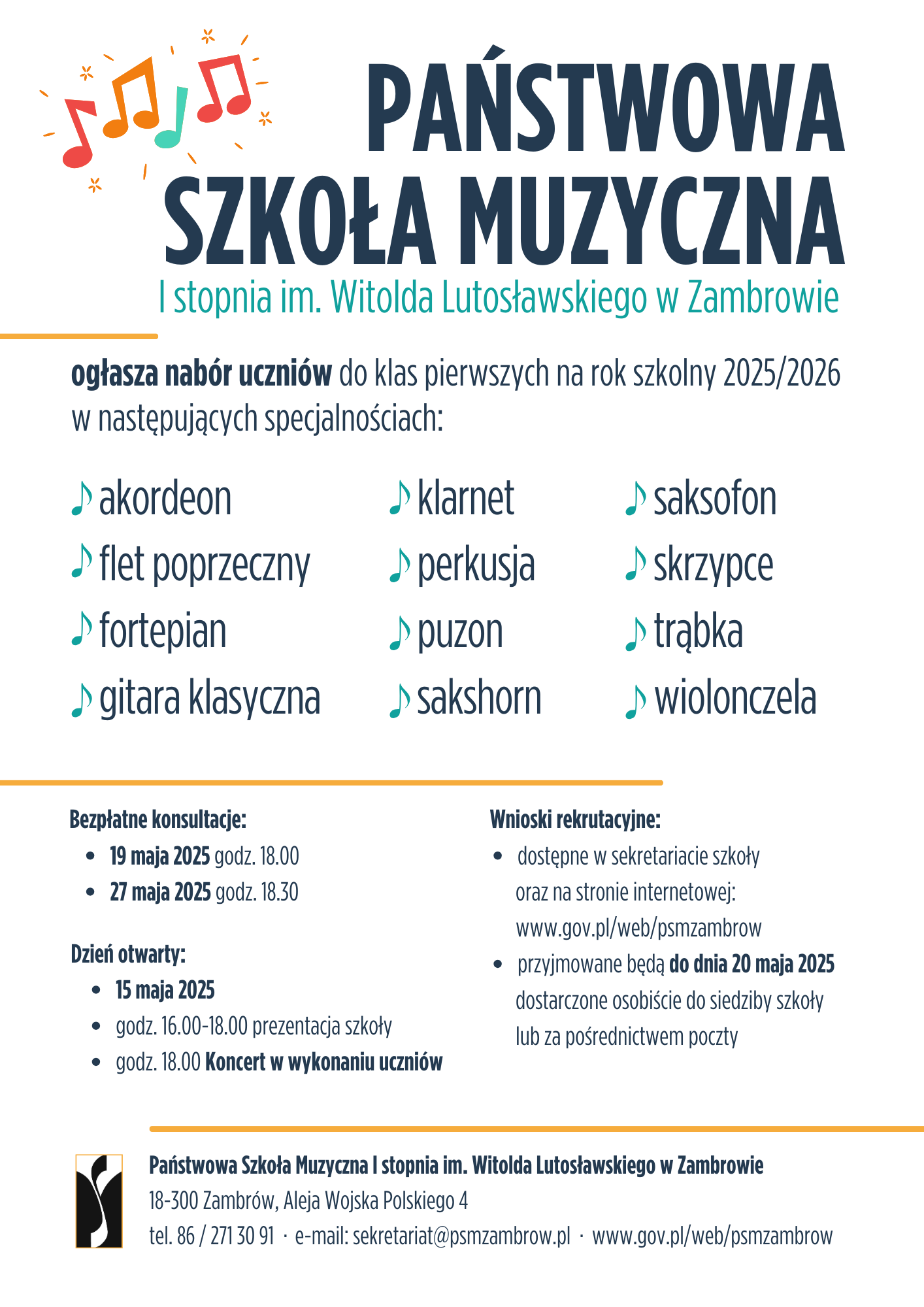 Miło nam jest ogłosić nabór uczniów na kolejny rok szkolny. Państwowa Szkoła Muzyczna I stopnia im. Witolda Lutosławskiego w Zambrowie jest publiczną placówką kształcenia artystycznego prowadzoną przez Ministra Kultury i Dziedzictwa Narodowego.