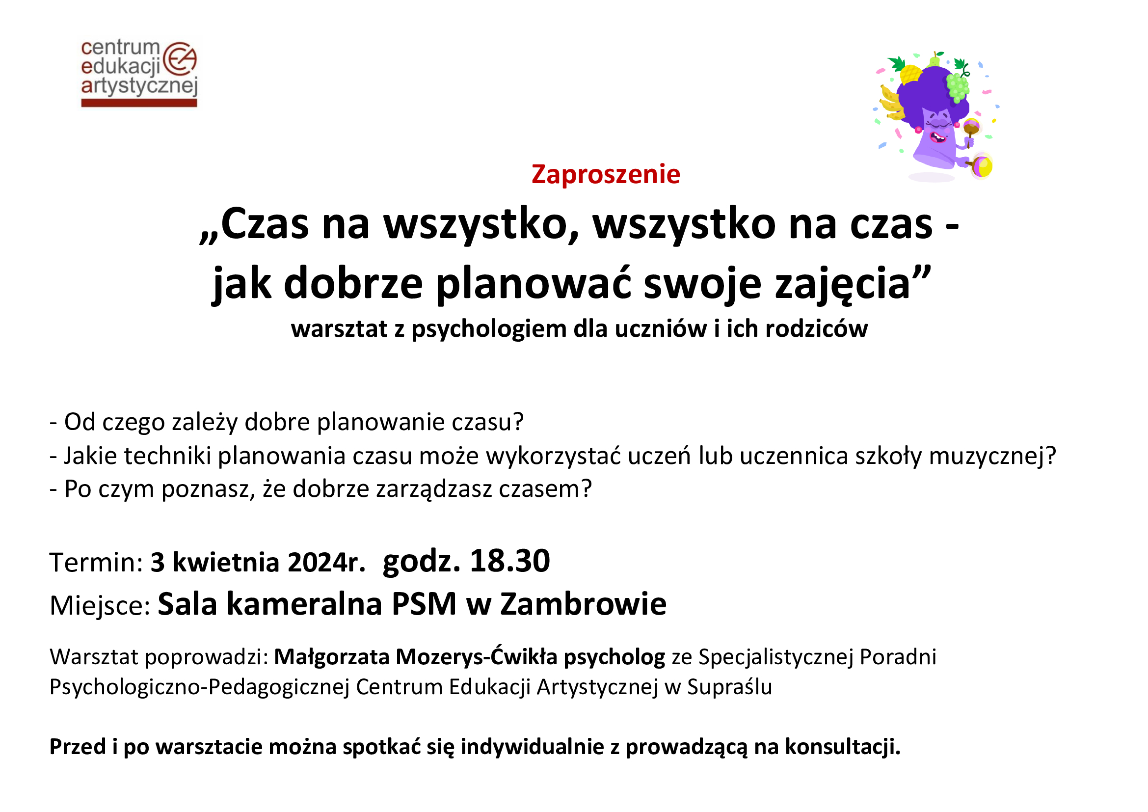 Warsztaty z Psychologiem Centrum Edukacji Artystycznej 03.04.2024 26.03.2024 Zdjęcia (1) Pokaż zdjęcie 1 z galerii.