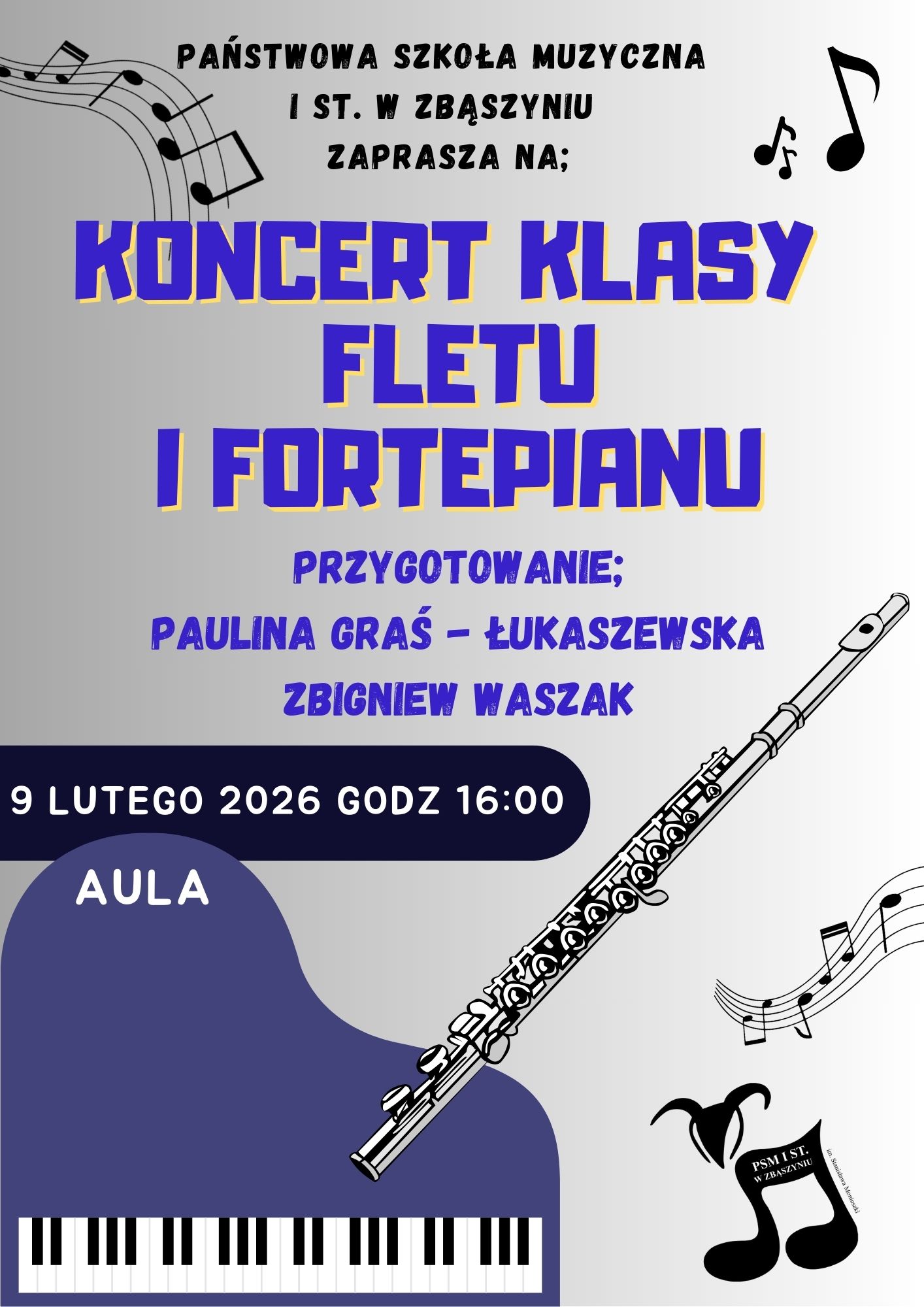 Uczniowie klasy fletu Pani Pauliny Graś - Łukaszewskiej i fortepianu Pana Zbigniewa Waszaka zapraszają na koncert.