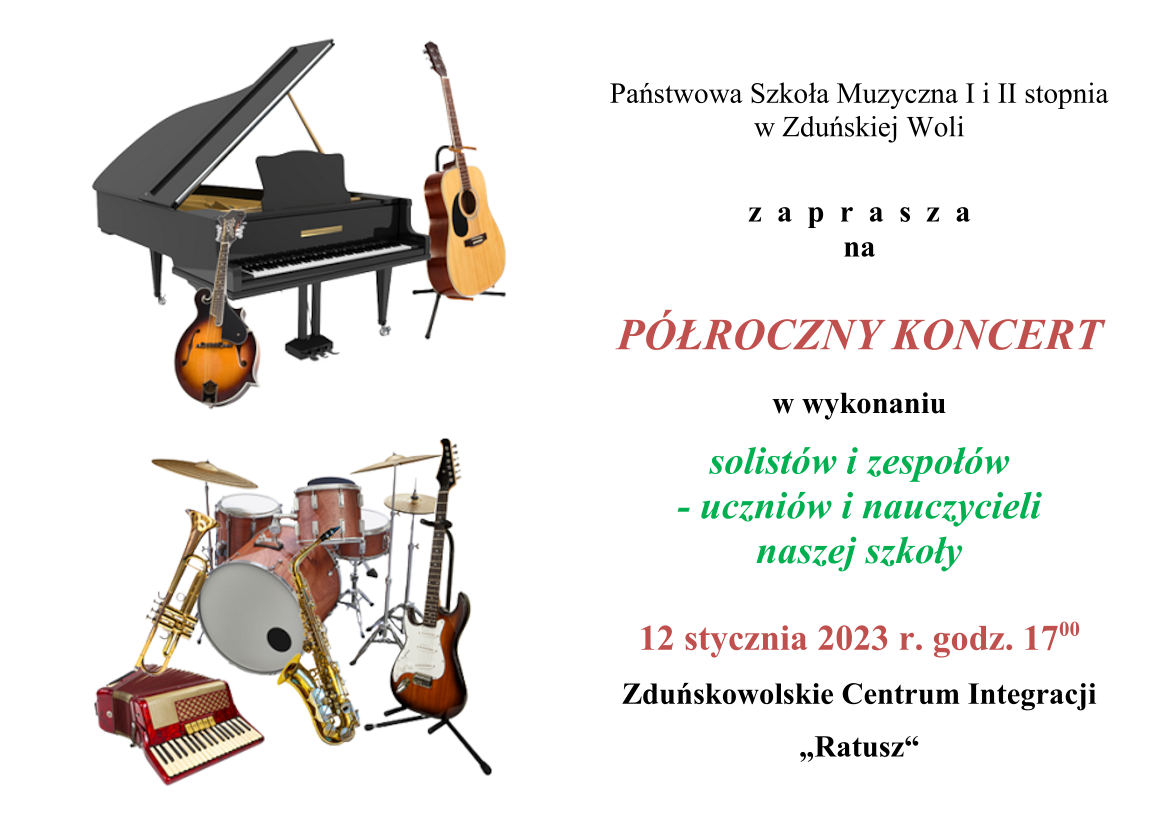 Zapraszamy na półroczny koncert w wykonaniu solistów i zespołów - uczniów i nauczycieli naszej szkoły, który odbędzie się 12 stycznia 2023 r. godz. 17:00 w Zduńskowolskim Centrum Integracji "Ratusz".