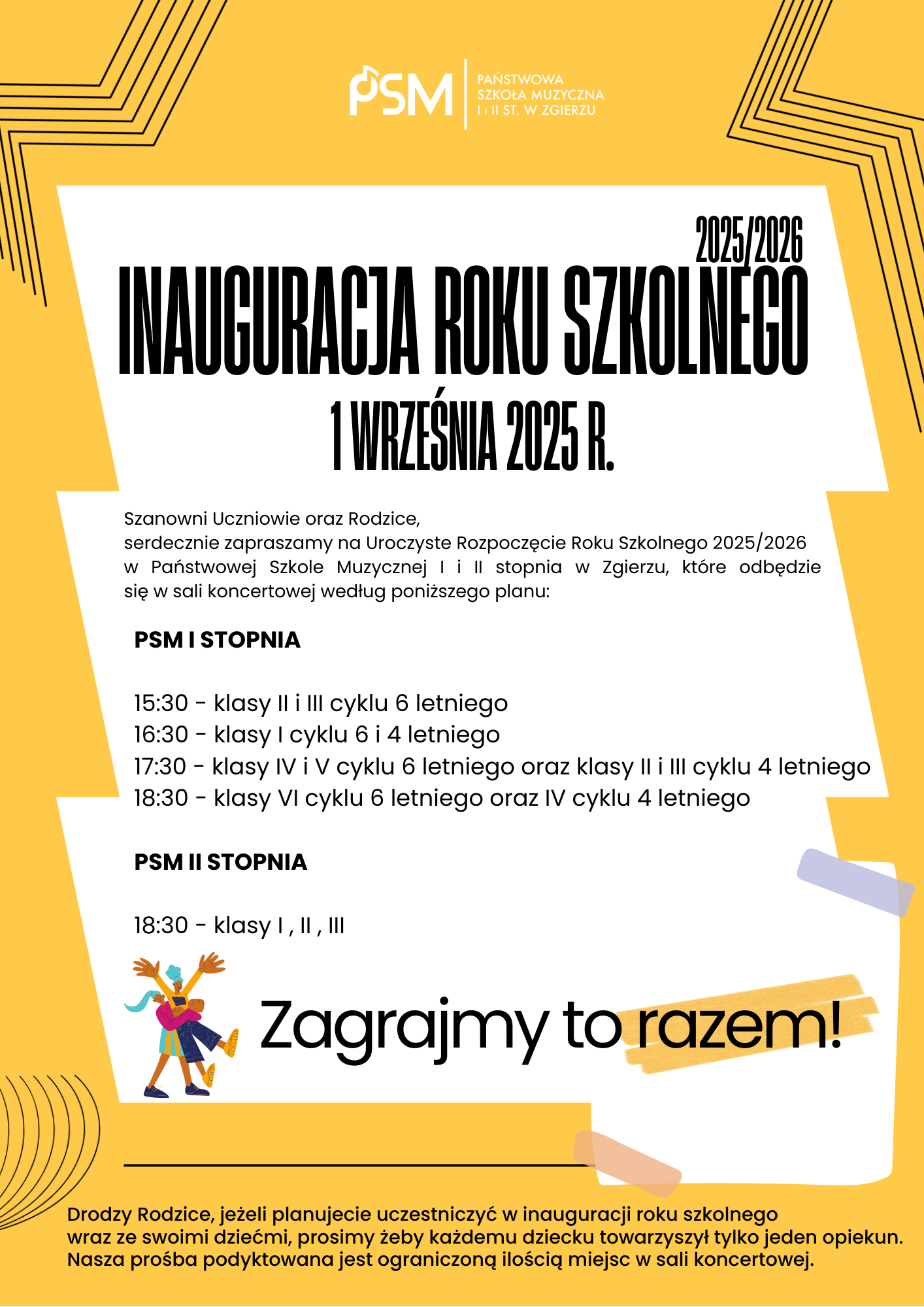 serdecznie zapraszamy na Uroczyste Rozpoczęcie Roku Szkolnego 2025/2026 w Państwowej Szkole Muzycznej I i II st. w Zgierzu, które odbędzie się w sali koncertowej według poniższego planu: